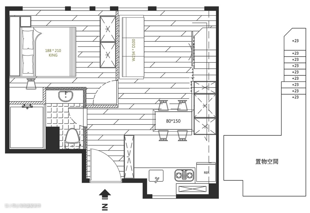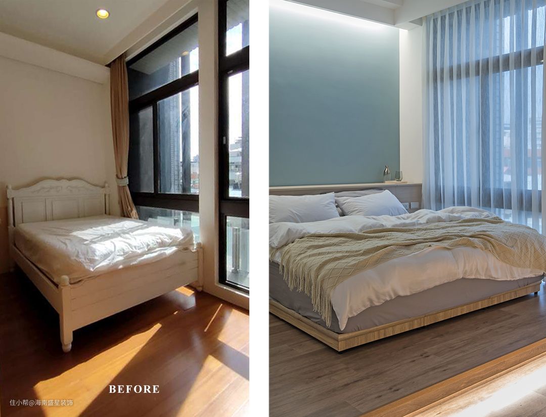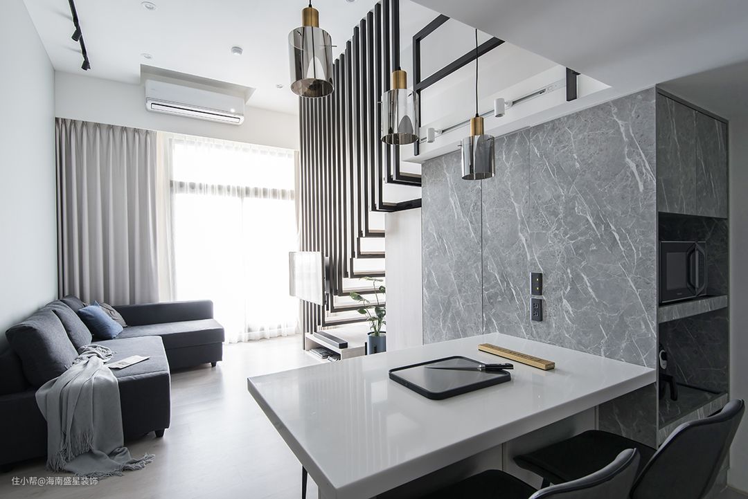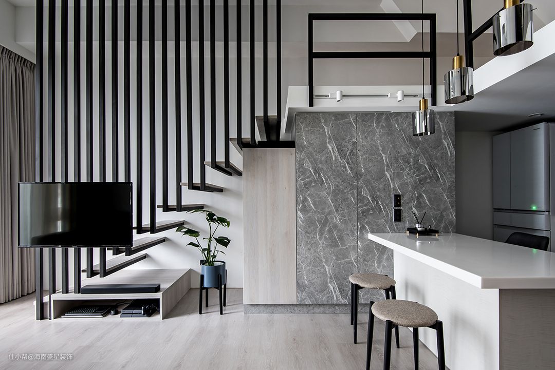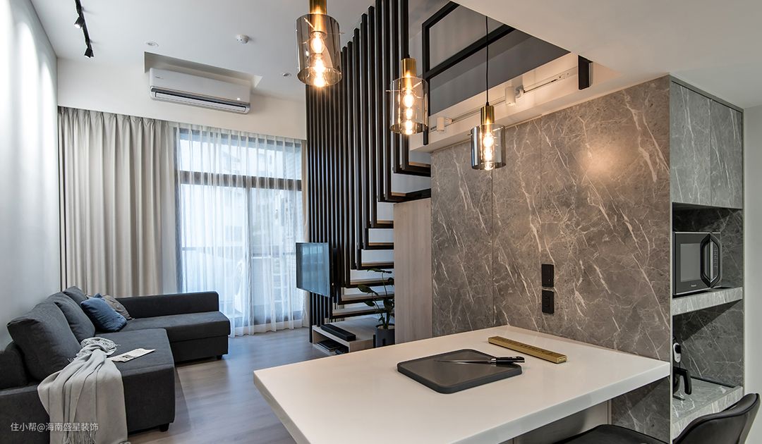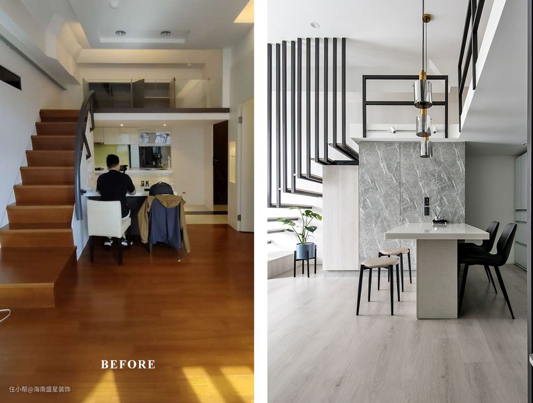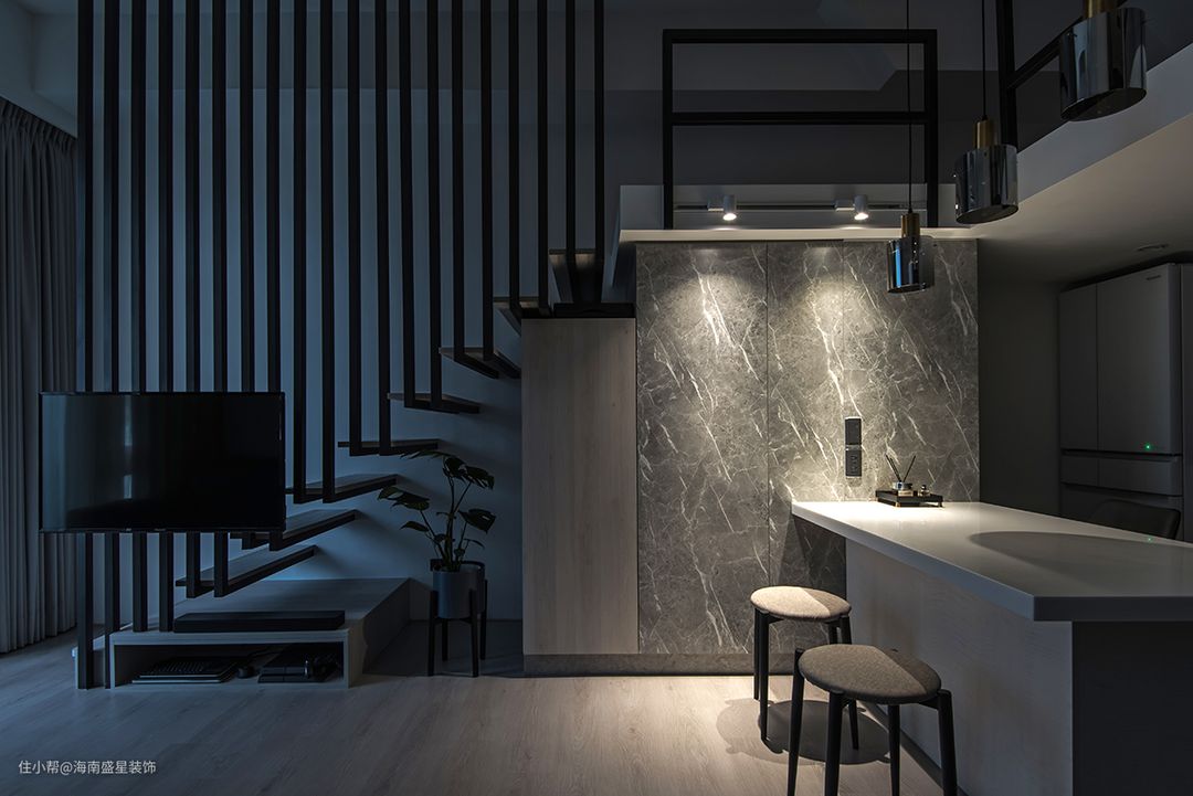 本案是老屋翻修除了翻新扩建工程,还须拆除原有物件,无论在预算考察,或环保议题,经常是设计团队再三思量难题,经过沟通讨论后,留存了状况依然良好餐厨中岛台,采用抛光打磨工序修复物件,并重整台面下的橱柜门片。 保留通往上方阁楼原楼板结构,达到置物平台再利用性能,降低二度拆除工程,仅重新将楼梯由原9踏阶调整为11踏阶,并拆除原有扶手,以线形深色铁件,贯穿整体楼间,随着一纵上升阶梯,扩增小坪数,提升高储物机能,亦轻拥了现代美式Loft开放式阁楼。 房屋基本情況 房屋位置:海南•海口 房屋面积:面积60㎡ 房屋户型:1房1厅1卫 常住人口:夫妻俩人 装修需求:最大化收纳性能,改善原采光不佳景况