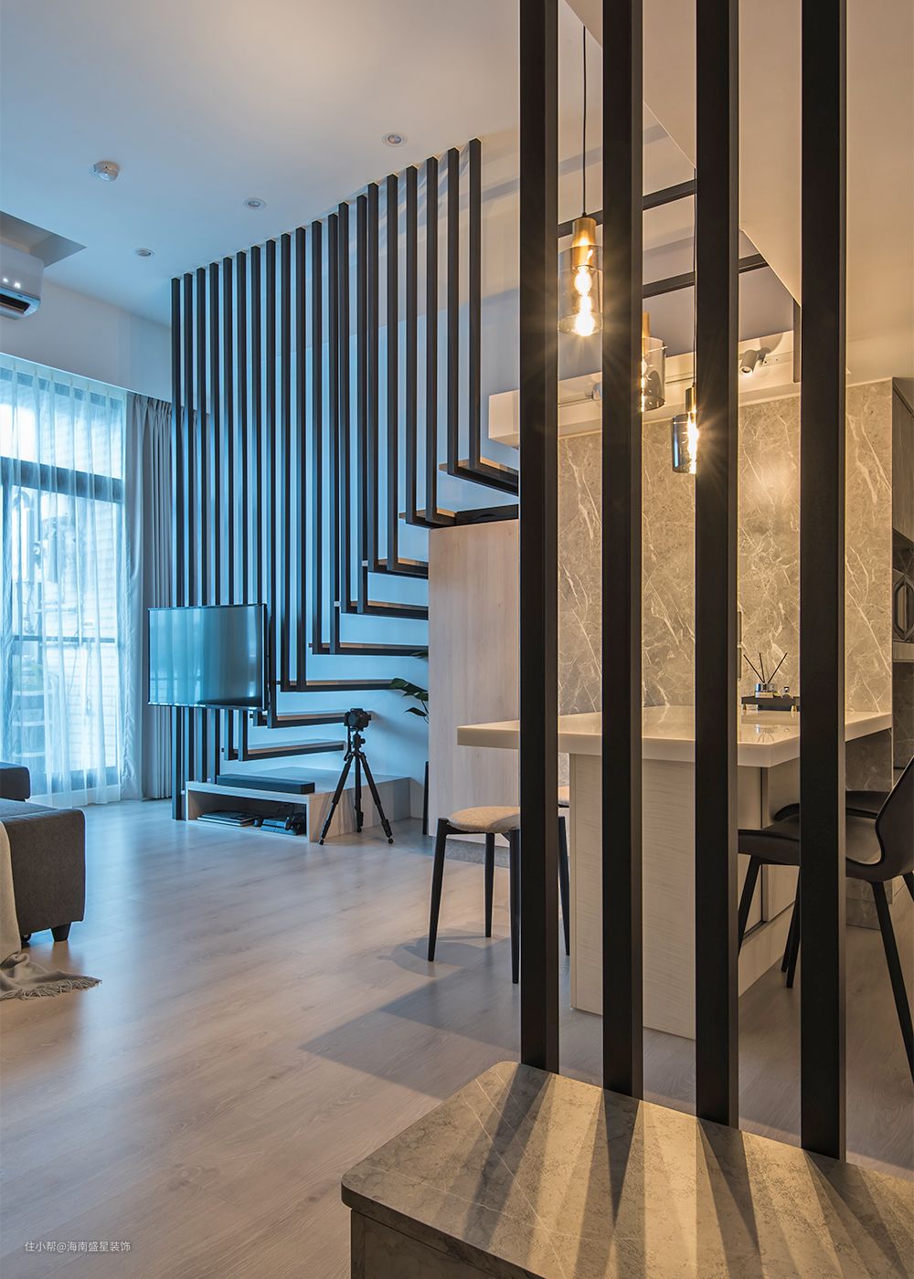 延续玄关微量铁件格栅,拆除原老式楼梯扶手,以黑色格栅铁件作为穿引,由天花到每一踏阶,皆以90度垂直角,随着坡度搭建一根根铁件,无论从任何视角,都可见线条纵且深密实结构,不仅构成安全攀爬上楼的扶手面,更以装置艺术之演绎,幻化为电视主墙,沙发背墙则滚涂灰色美式油漆与之相映。