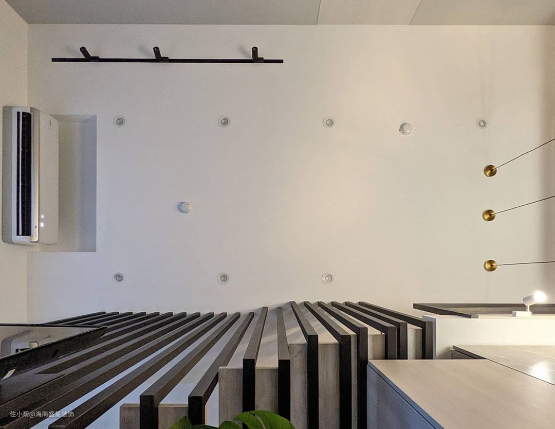 延续原有楼板结构,阶梯重设扶手样式,上方高度约为1.4米左右,阁楼原以玻璃作为隔屏,慎思安全考察,与黑系铁件风相融,上层改以崁入式造型铁件,构成楼面造型,达到隔屏用途。