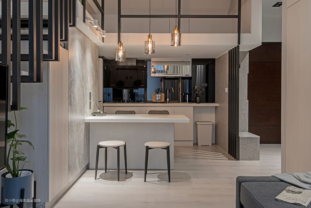 本案是老屋翻修除了翻新扩建工程,还须拆除原有物件,无论在预算考察,或环保议题,经常是设计团队再三思量难题,经过沟通讨论后,留存了状况依然良好餐厨中岛台,采用抛光打磨工序修复物件,并重整台面下的橱柜门片。 保留通往上方阁楼原楼板结构,达到置物平台再利用性能,降低二度拆除工程,仅重新将楼梯由原9踏阶调整为11踏阶,并拆除原有扶手,以线形深色铁件,贯穿整体楼间,随着一纵上升阶梯,扩增小坪数,提升高储物机能,亦轻拥了现代美式Loft开放式阁楼。 房屋基本情況 房屋位置:海南•海口 房屋面积:面积60㎡ 房屋户型:1房1厅1卫 常住人口:夫妻俩人 装修需求:最大化收纳性能,改善原采光不佳景况