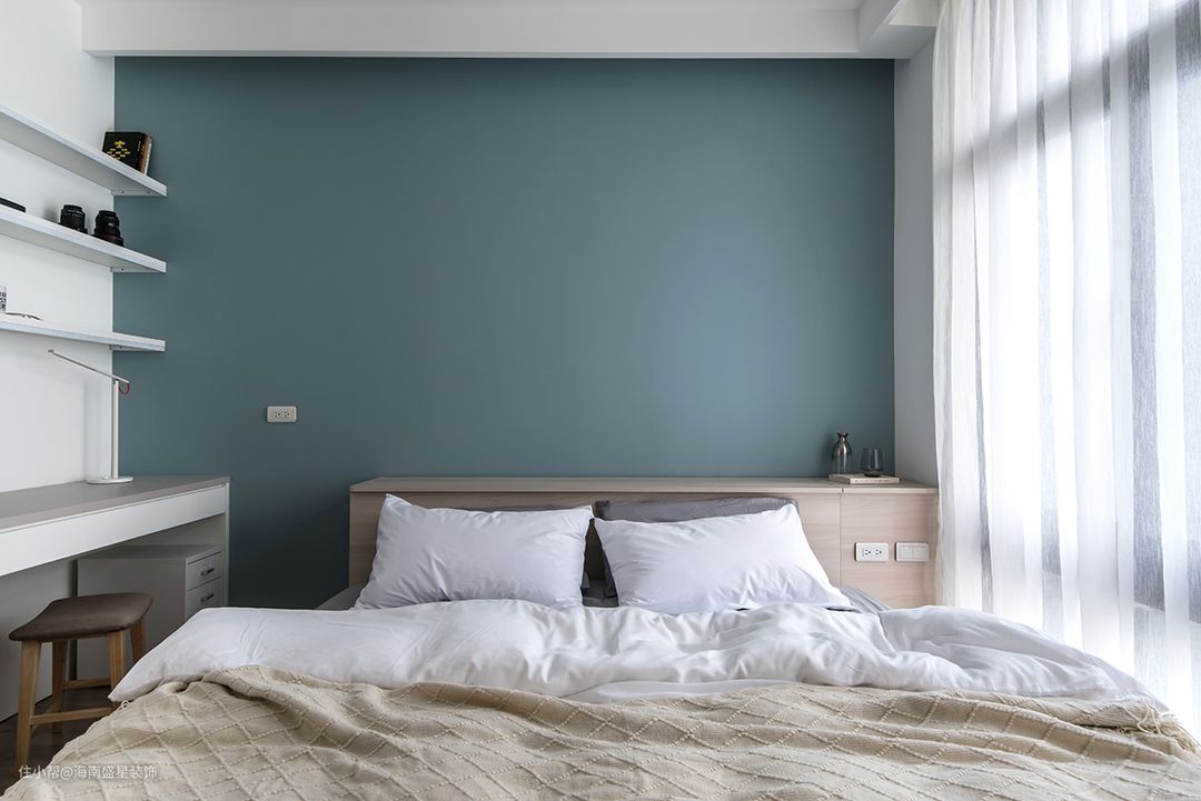 淡雅蓝系契合钟爱色系,引曝式局部光源,地板再添一线灯带,床边更巧妙隐藏于墙侧,有一式简单书桌与层板,从房门入口全然无法窥见书桌,使卧室更显利落。
