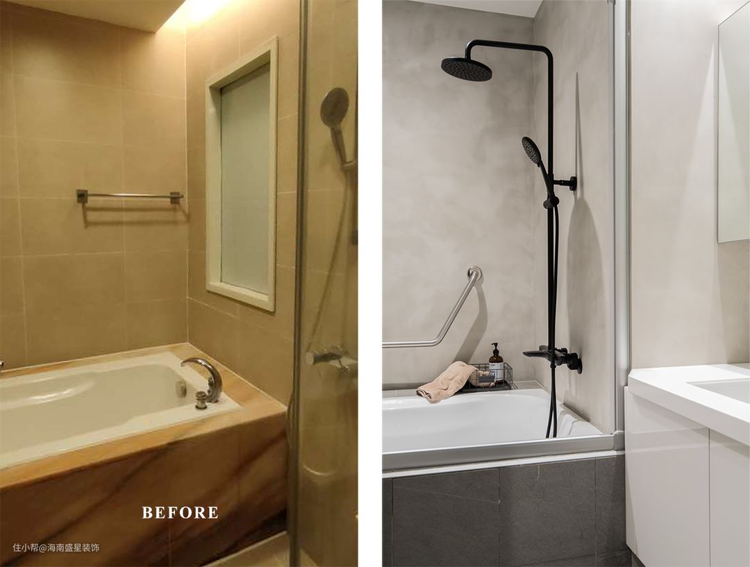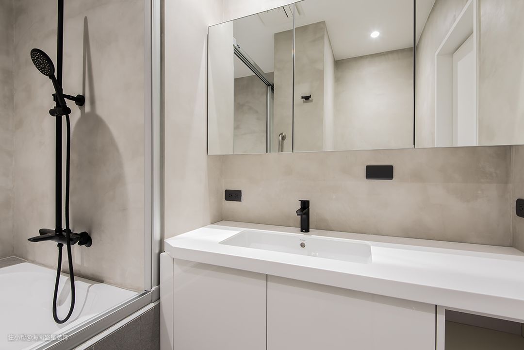 采用大地灰泥色泽漆面,也扩增盥洗台面为两人使用型态,砌一处泡澡浴缸,同时型塑干湿分离区,洗沐沉浸在旅居每一刻。