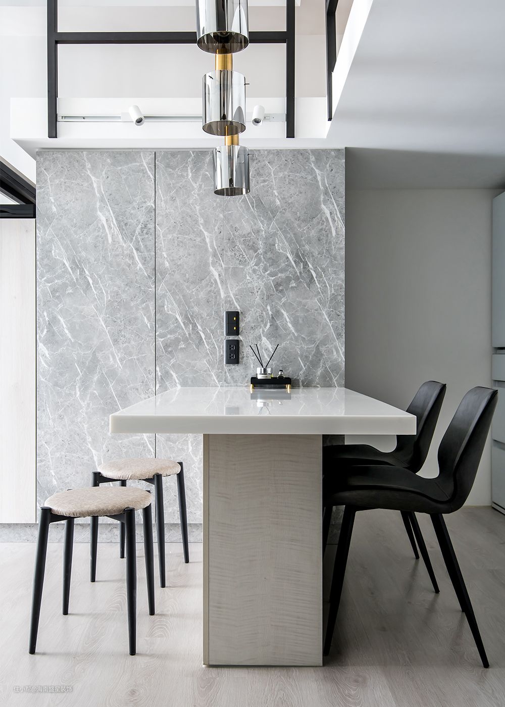 电视墙往右侧继续延伸,以灰色人造石铺叙,成为客餐厅之际过渡,然则电视主景与灰色纹理比例,刻意落在5:3,占据比例5的铁件看似沉稳,却辅以虚实特质,接引并筛落光线,比例3的灰色石材,看似包覆力强,却有亮面晶莹质感,两者共构了现代时尚Loft氛围。