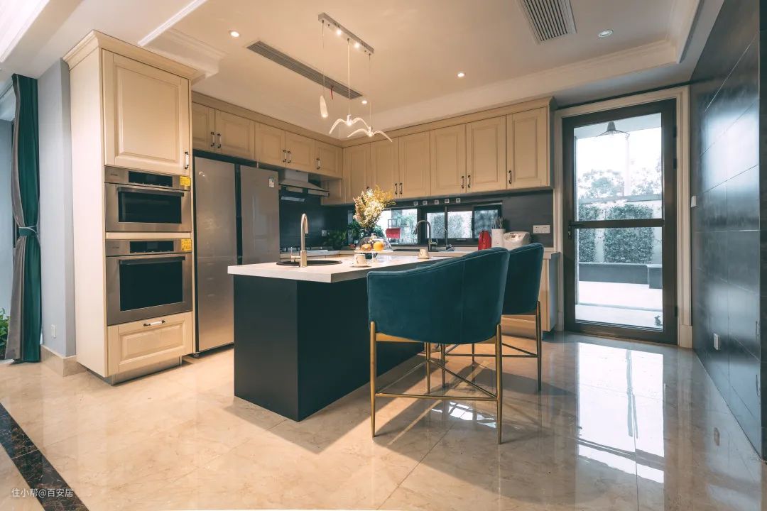 中岛台半边悬空,将料理台、吧台合二为一,不仅延伸厨房功能、增加收纳空间,更方便一家人围坐在一起做饭聊天,增强家庭互动。