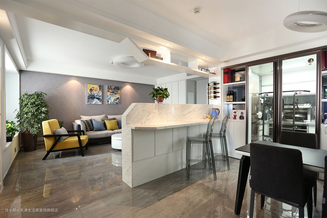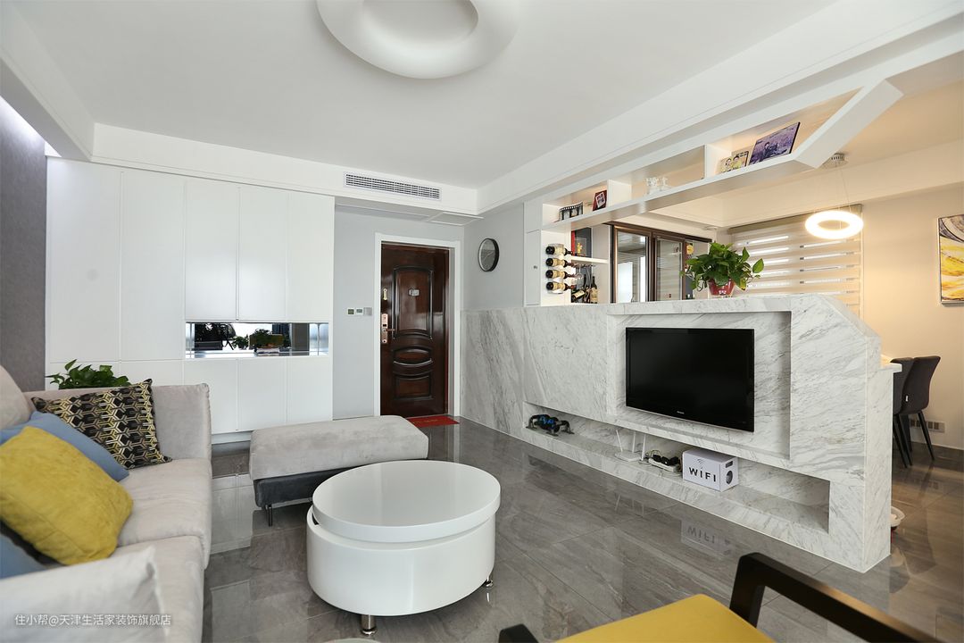 壁挂电视和电视柜嵌入大理石电视矮墙,上方的格子架配合电视墙做了斜角处理。打通了客餐厅的空间,丰富餐厅采光的同时也提升了空间活跃度。
