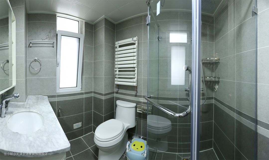 深灰色地砖延伸到墙面,同时做了一圈深灰腰线,让深灰和浅灰的砖色过渡更自然协调。