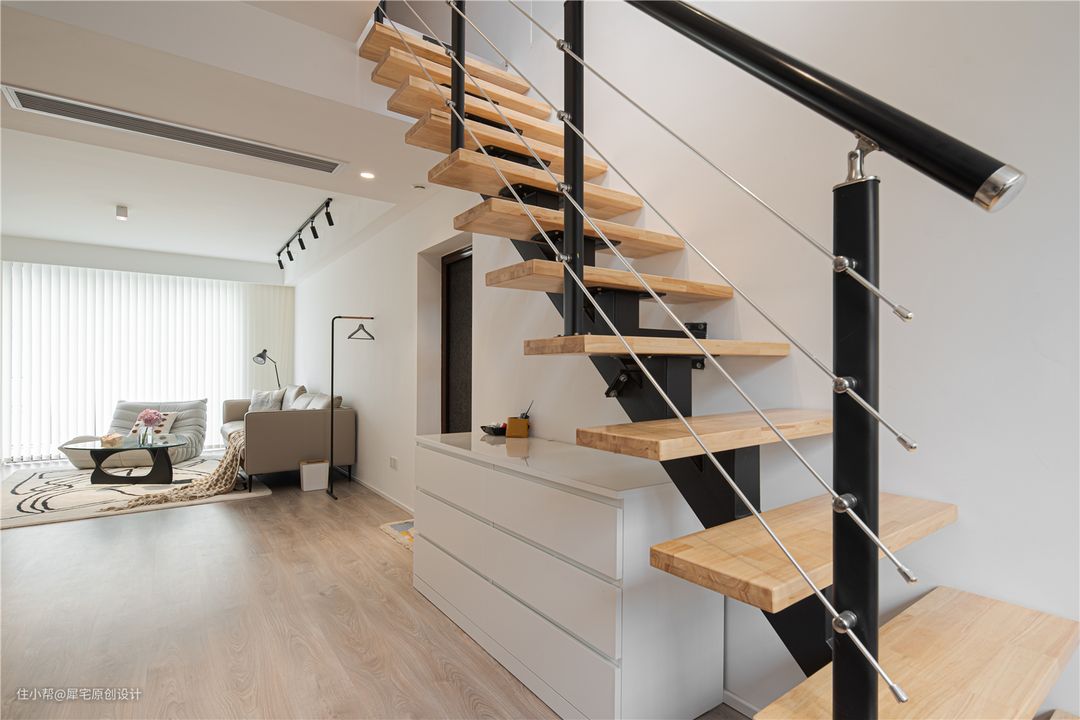 入户门开在横厅当中,没有独立门厅。利用楼梯下的空间,放了成品鞋柜,另一侧安装了简易挂衣架,满足日常换鞋和外套收纳需求。