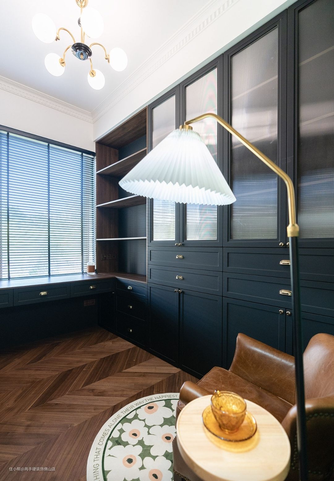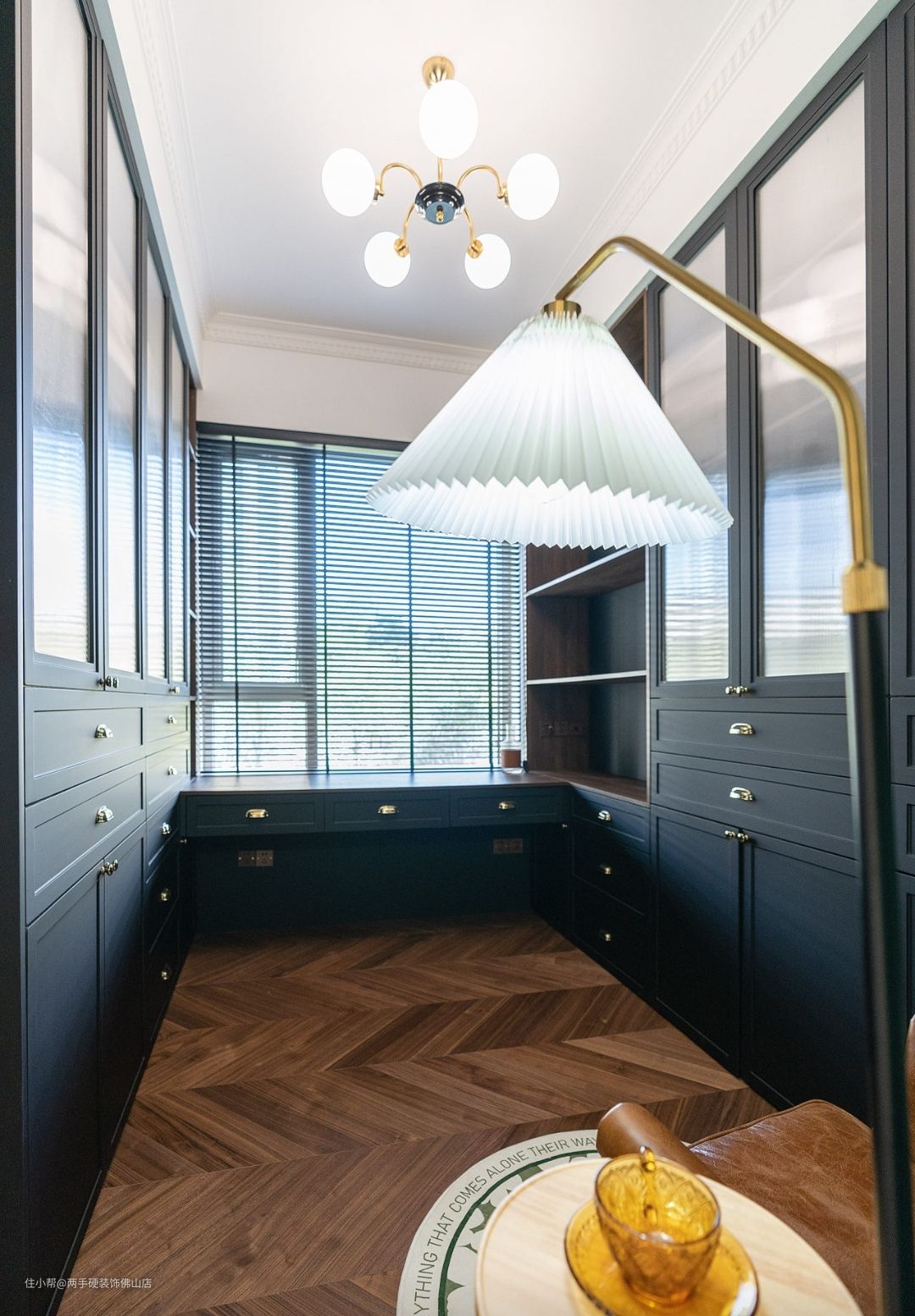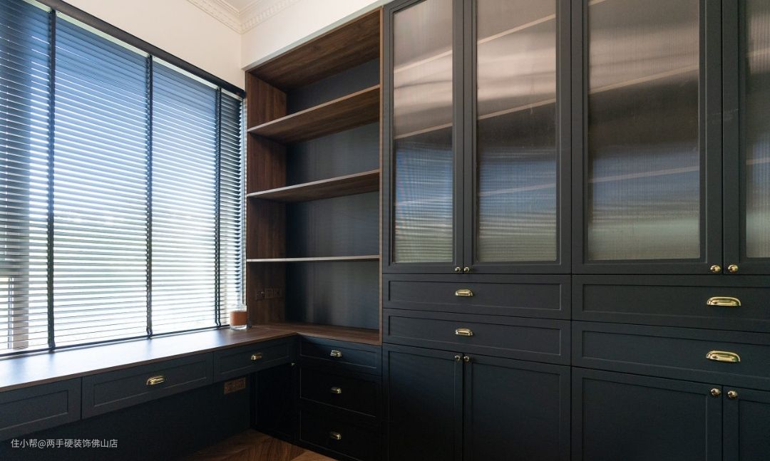 书房:书房是业主最关注也在家里呆的时间最久的空间。最总选择了沉稳的黑色做为书柜的主色
