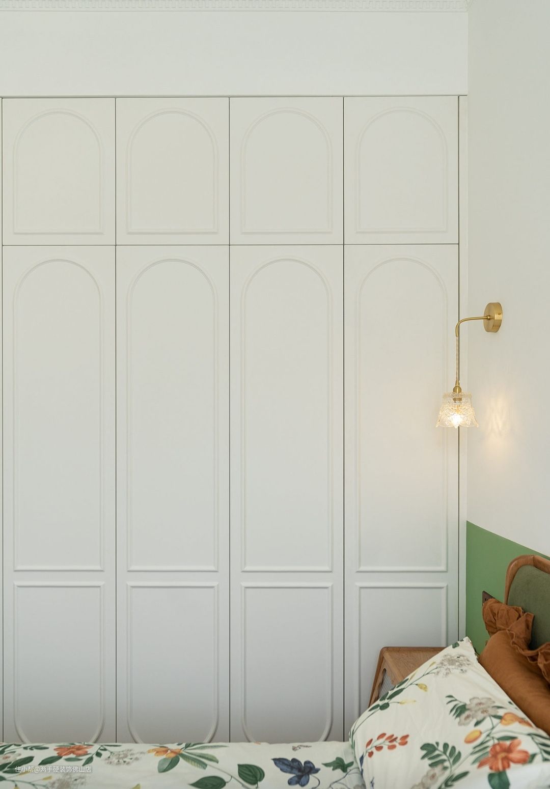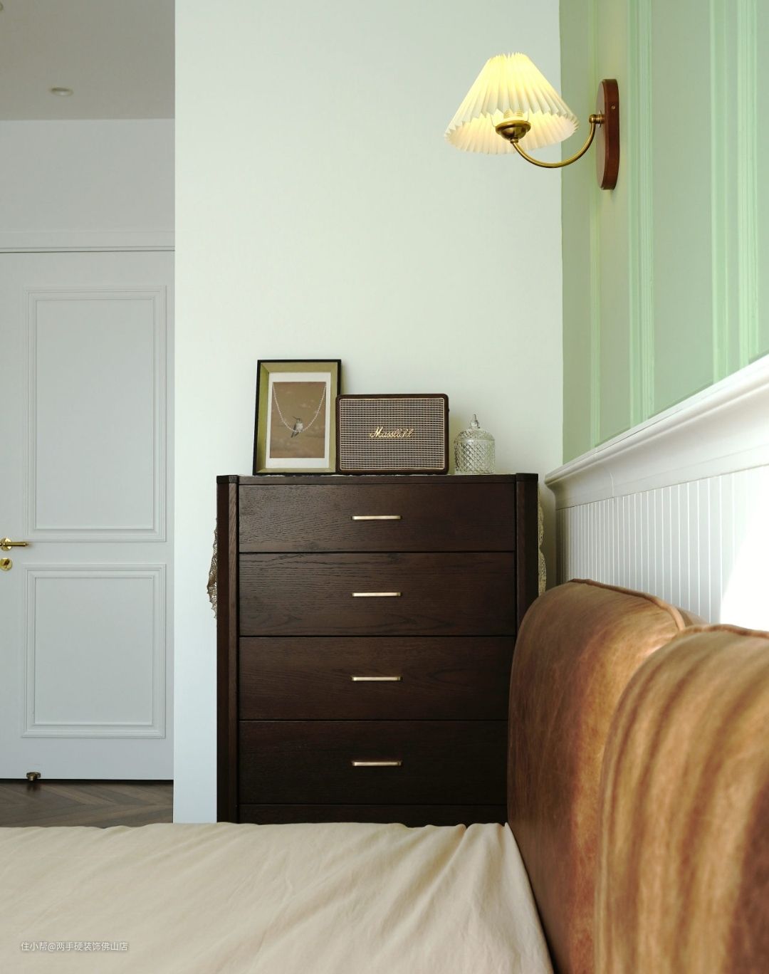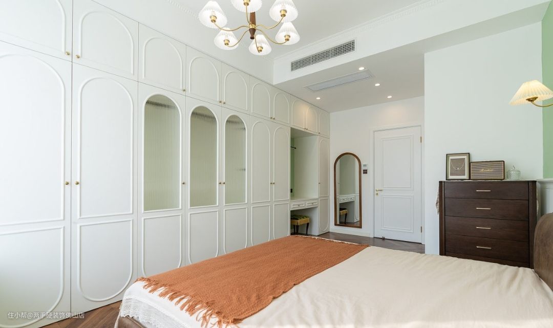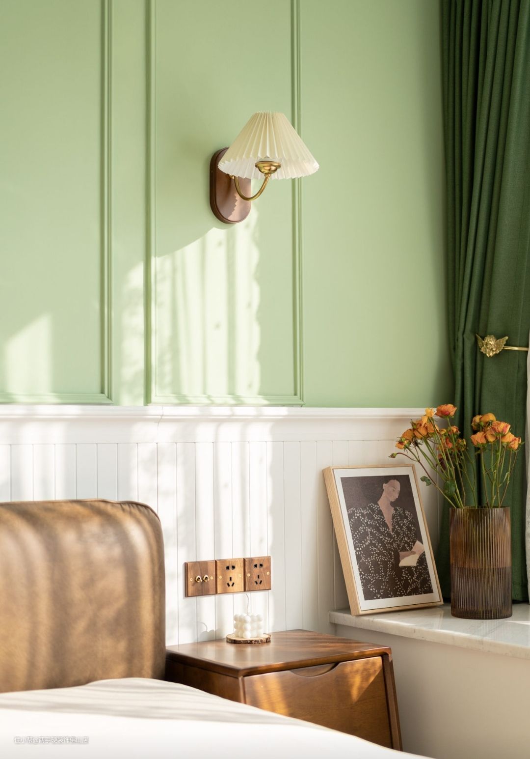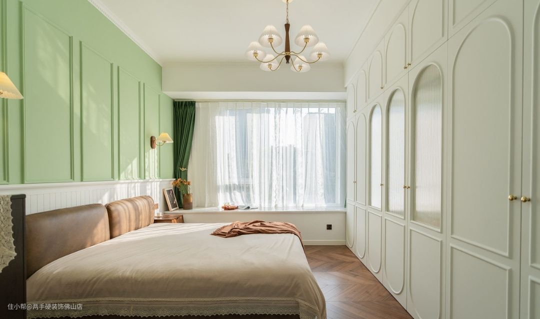 次卧:次卧保持了抹茶绿&焦糖色的主色调,但床头背景墙的设计则更加简约。简约壁灯+装饰挂画+绿白拼接撞色,法式风情更有韵味!