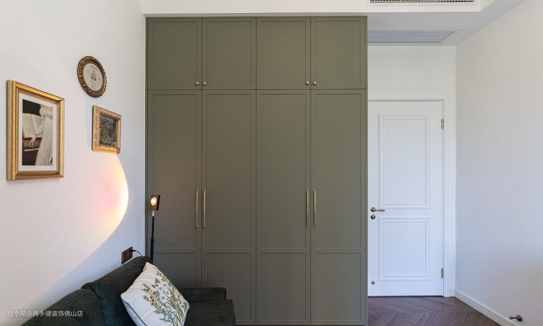 整墙式莫兰迪绿衣柜则采用全封闭式设计,简约的线条勾勒出层次感,在实现大储物功能的同时,也减少落灰打扫的负担。