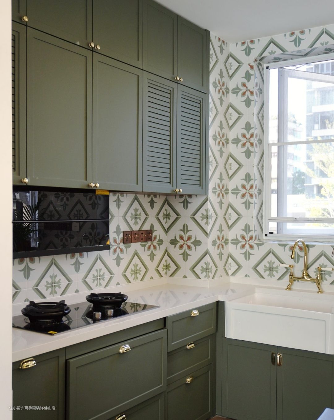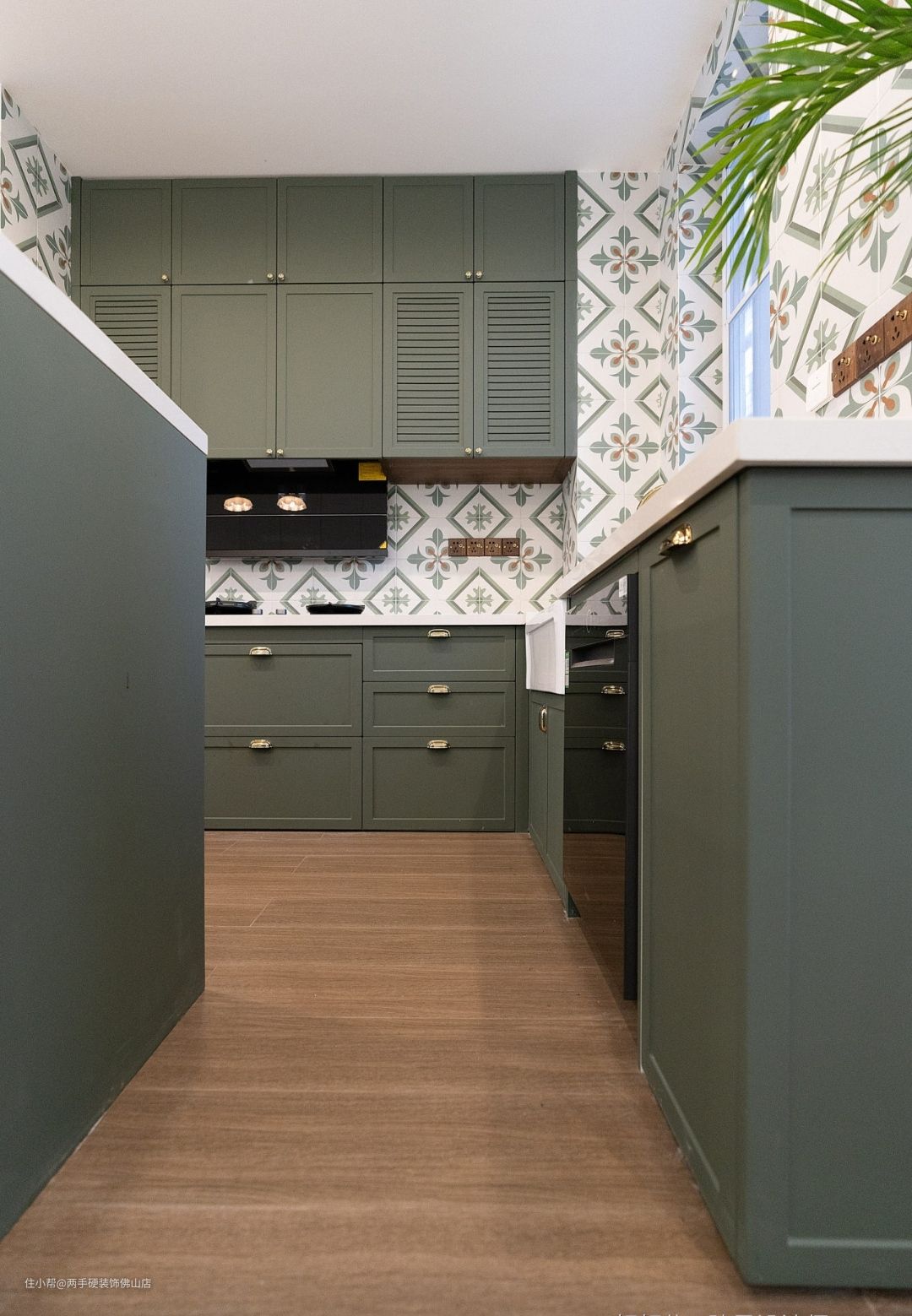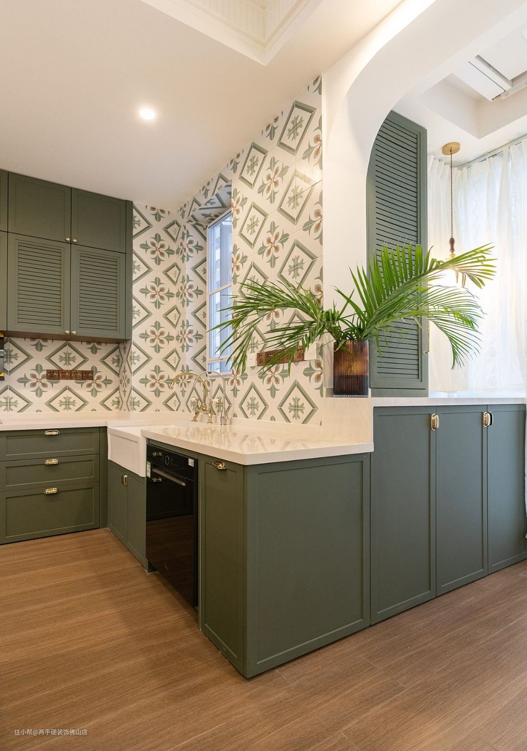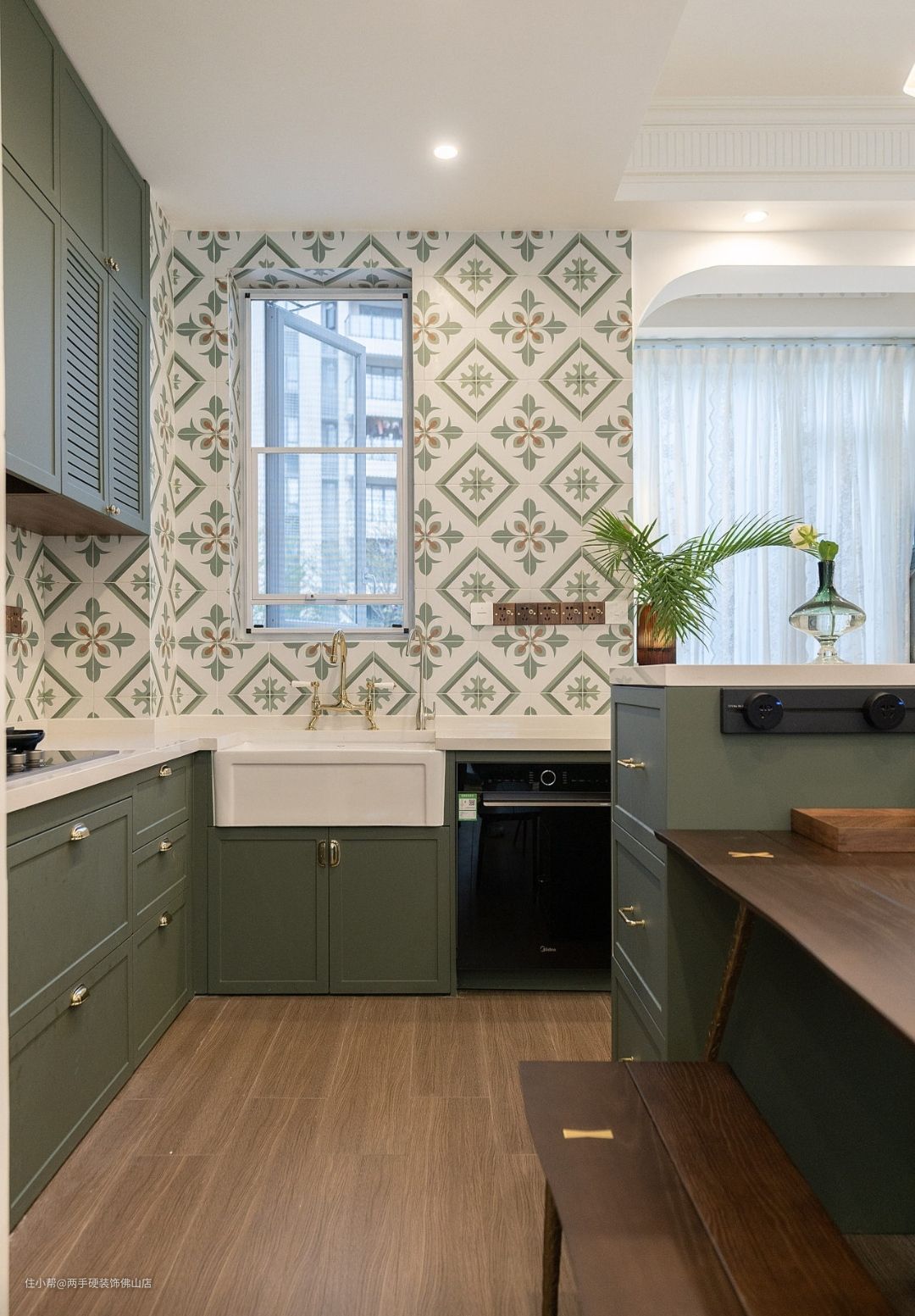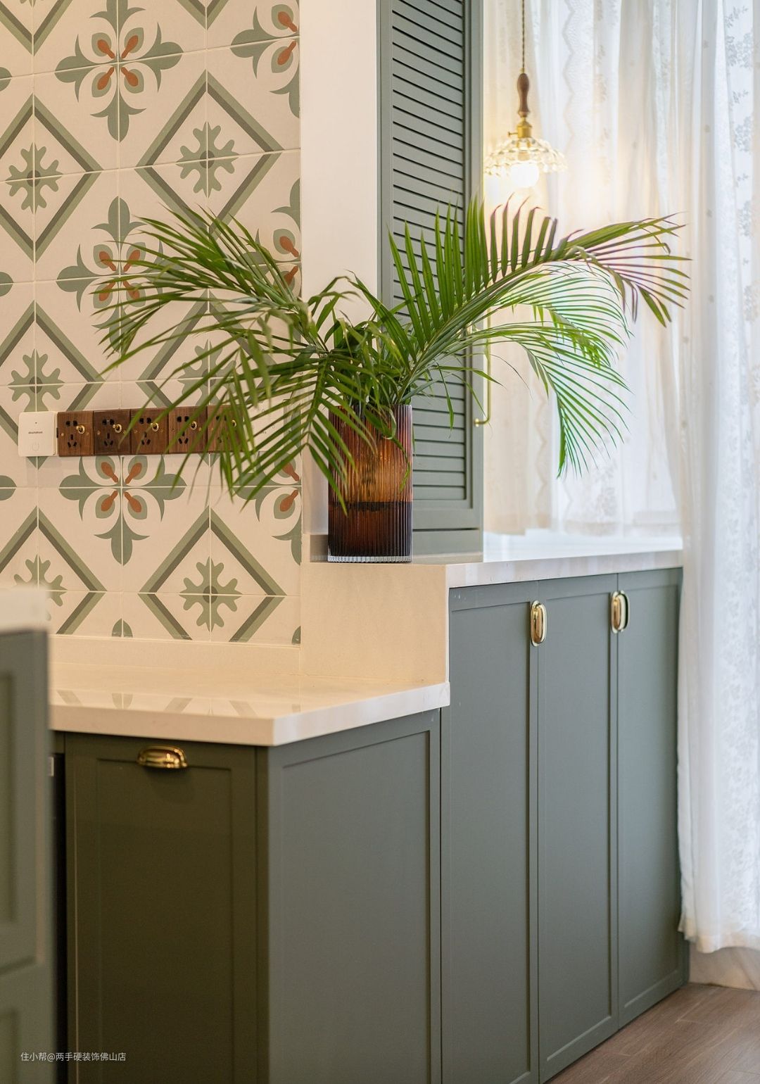 墙面:百叶帘柜门设计搭配上独特的法式同色系花砖,进一步丰富了视觉层次,让法式元素在空间中相互碰撞。