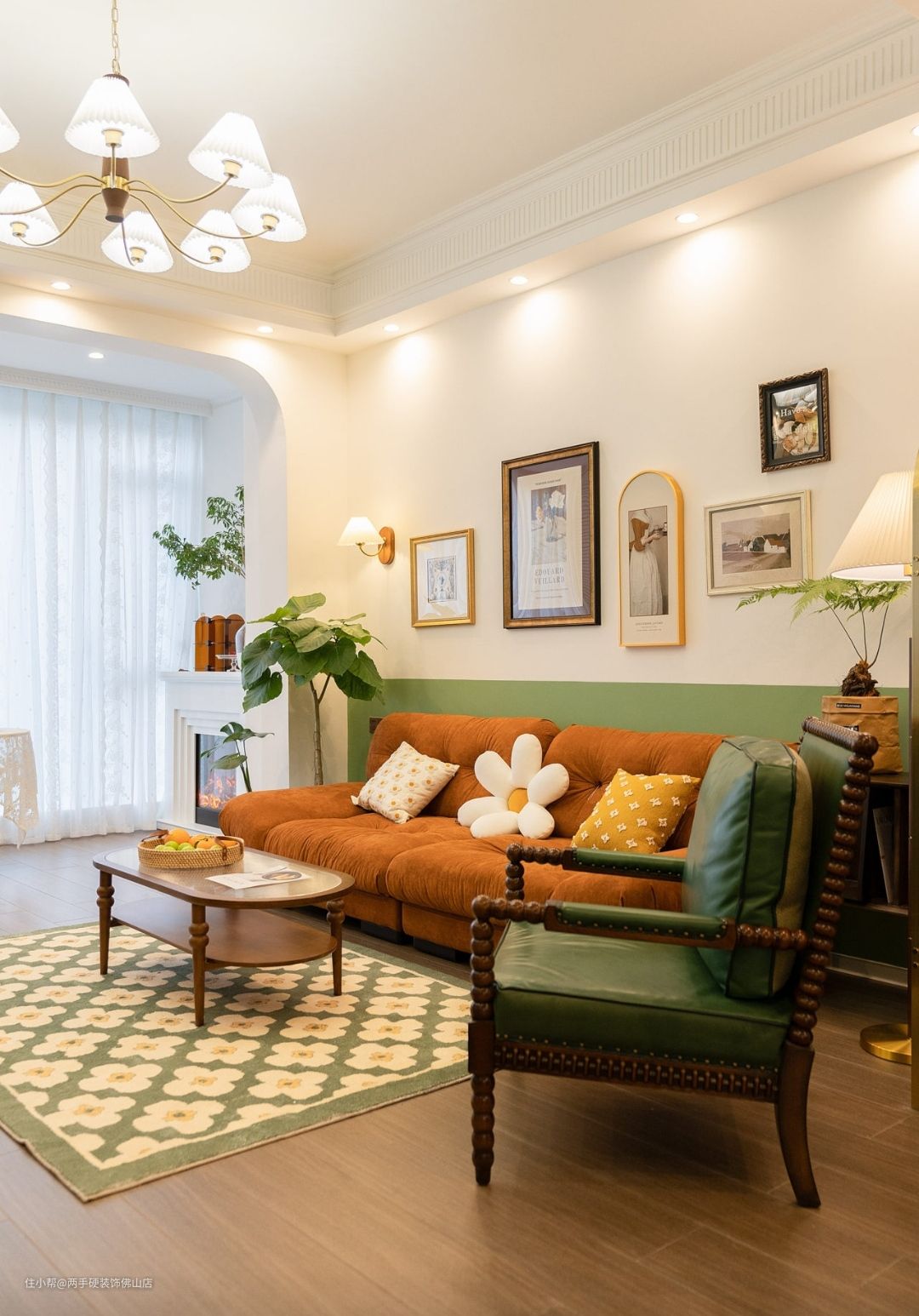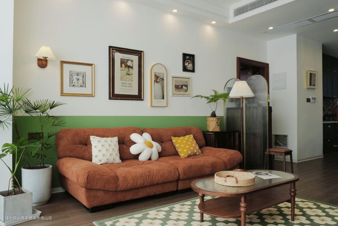 软装搭配:屏风背后的角落里,沙发边几和百褶落地灯,以及半墙的绿色,搭配焦糖色的云朵沙发,温馨又浪漫。