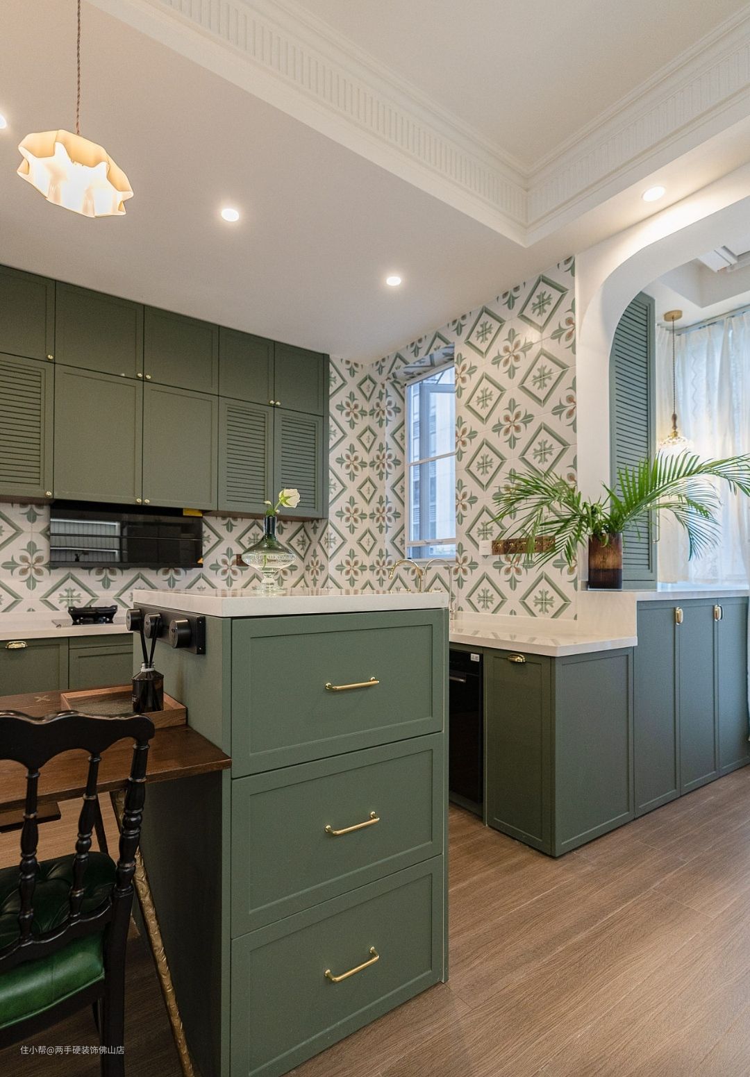 案例情况: 今天为大家分享的案例来自佛山,女主人是个非常非常优秀的保险经纪人,非常热情时尚,常年在多个国家旅行穿梭,曾经去过莫奈的故居,所以深深爱上了明亮浪漫的法式复古风格 业主需求: ①有几十个奖杯需要陈列,需要独立书房。②喜欢复古风。 后期设计: ①收纳 ②显得空间大③明亮又复古,希望我打造一处年轻范的法式复古风住宅。商讨后,我们以复古的牛油果绿为主色调,汇集法式石膏线、长虹玻璃、蕾丝等元素,呈现出浪漫慵懒的轻法式生活空间。