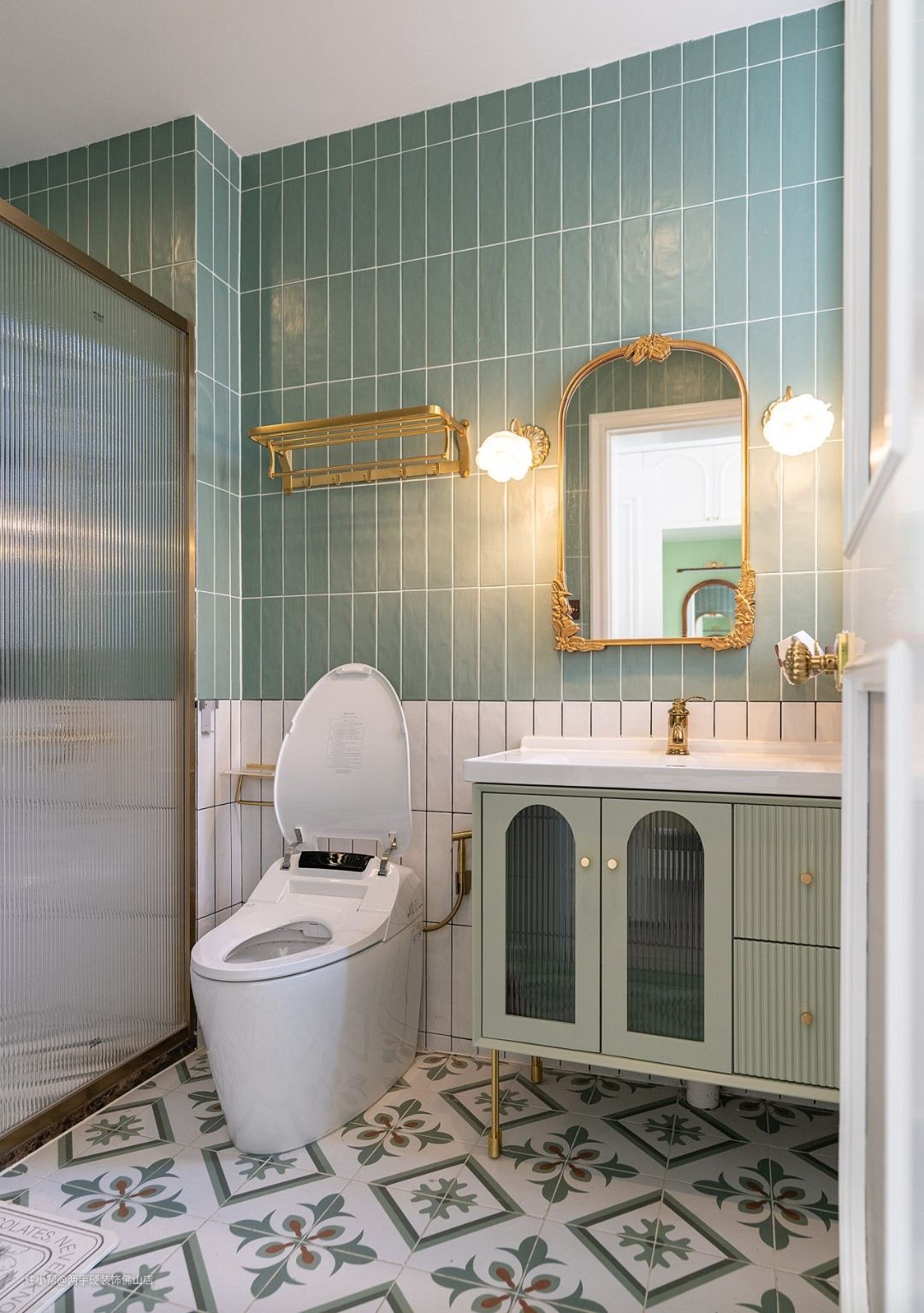 主卧卫生间:主卫是业主最喜欢的清新绿色小花砖的搭配。