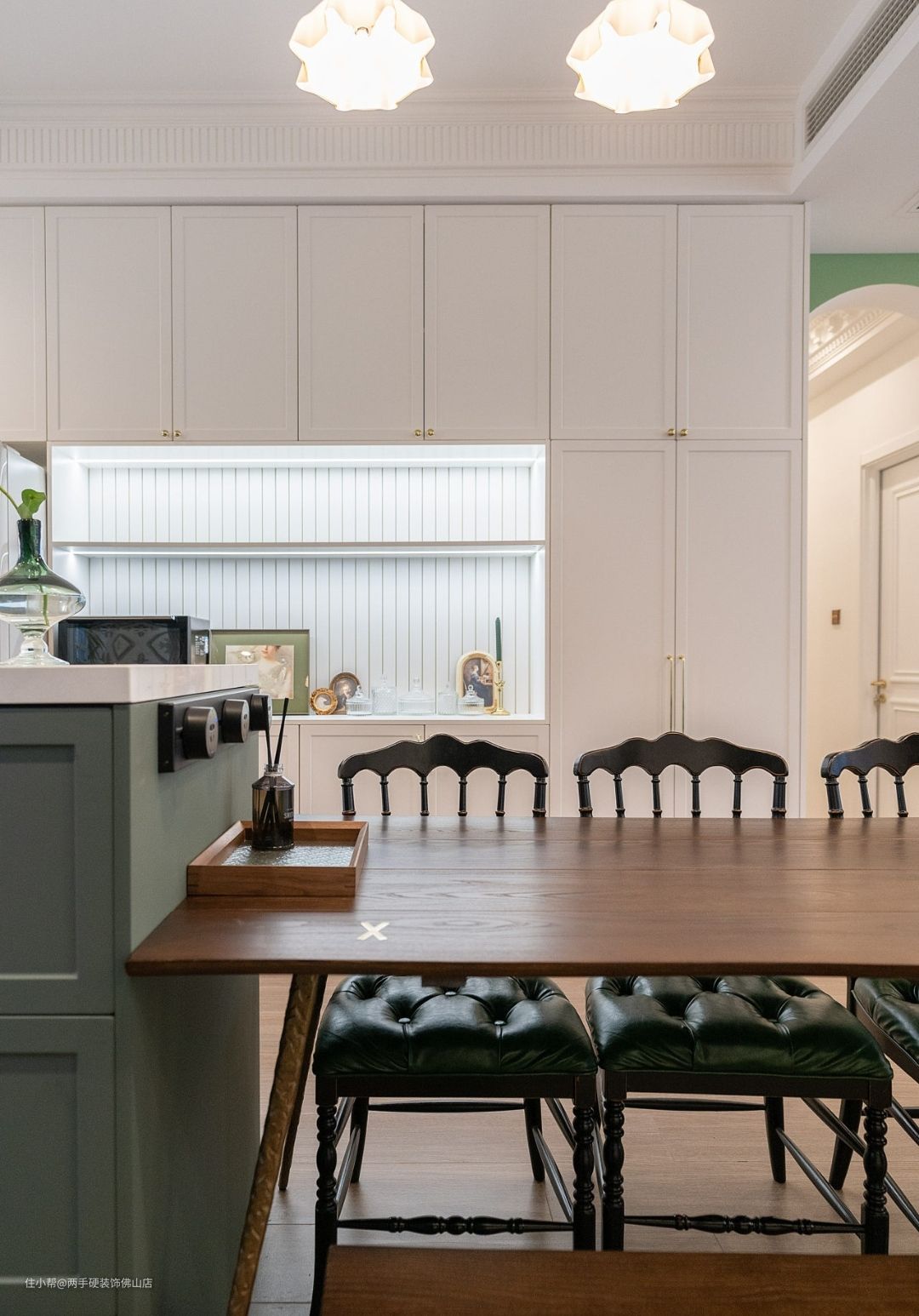 餐桌搭配:深棕色中古餐桌、复古绿皮垫座椅、暖色系花苞吊灯,每一件精美家具的选取,都彰显出浓烈的法式复古气质。餐厅不止是用餐空间,每一处,都藏着对生活的热爱。