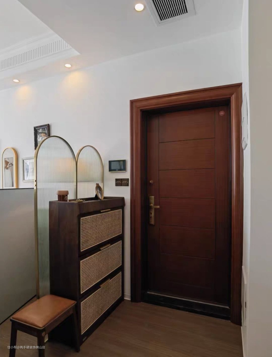 入户玄关:目前的格局比较南北对流,所以我们并没有故意隔出比较大的区域做玄关,只是在入户,放置了一扇拱形长虹玻璃屏风加独立的成品鞋柜 ,这样子可以最大限度的显得空间明亮开阔。常用鞋子放门口鞋柜,而其他鞋子,包包和衣物的收纳则放在走廊偷出来的空间里。