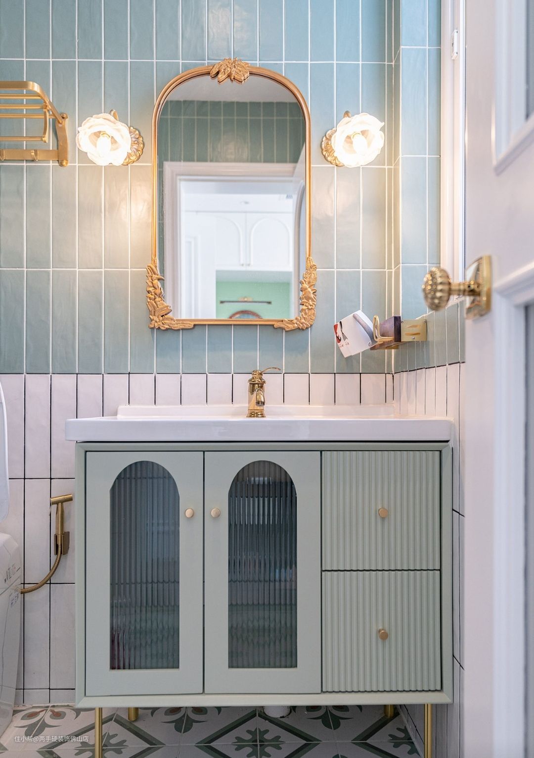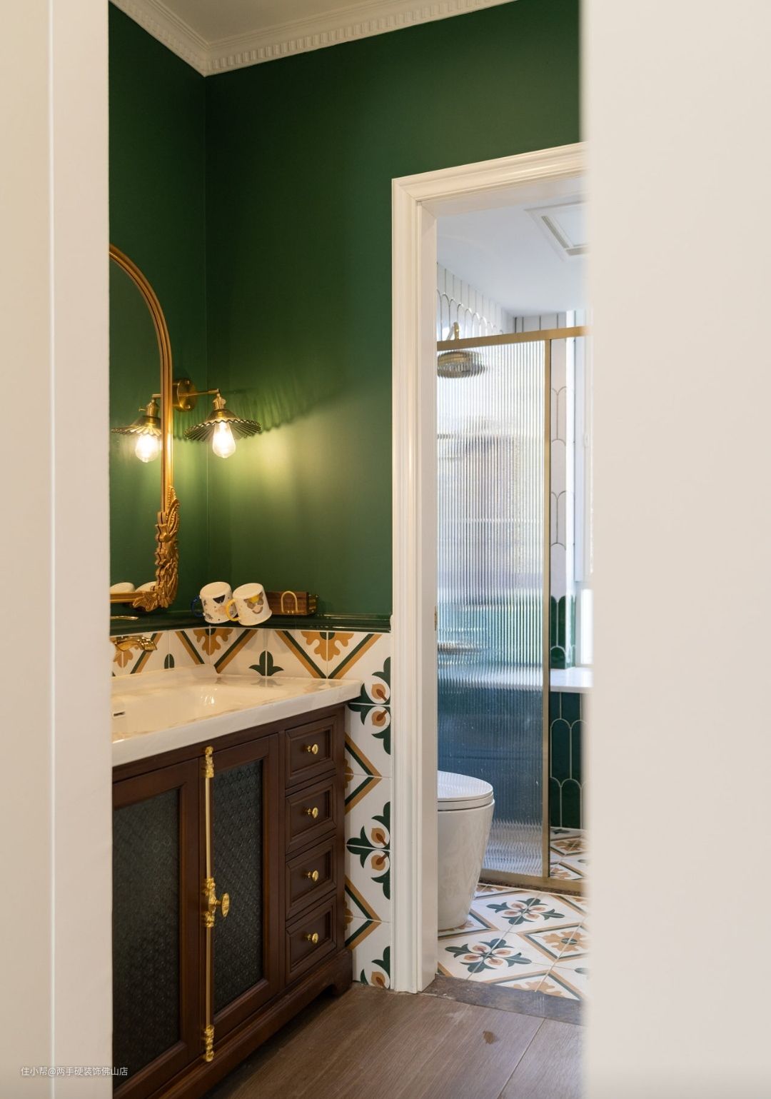 简白台面+复古木系洗手柜+墨绿墙面,法式气息浓郁。香槟金把手造型精致,搭配亚铜梳妆镜&复古琉璃壁灯,轻奢气质尽显。
