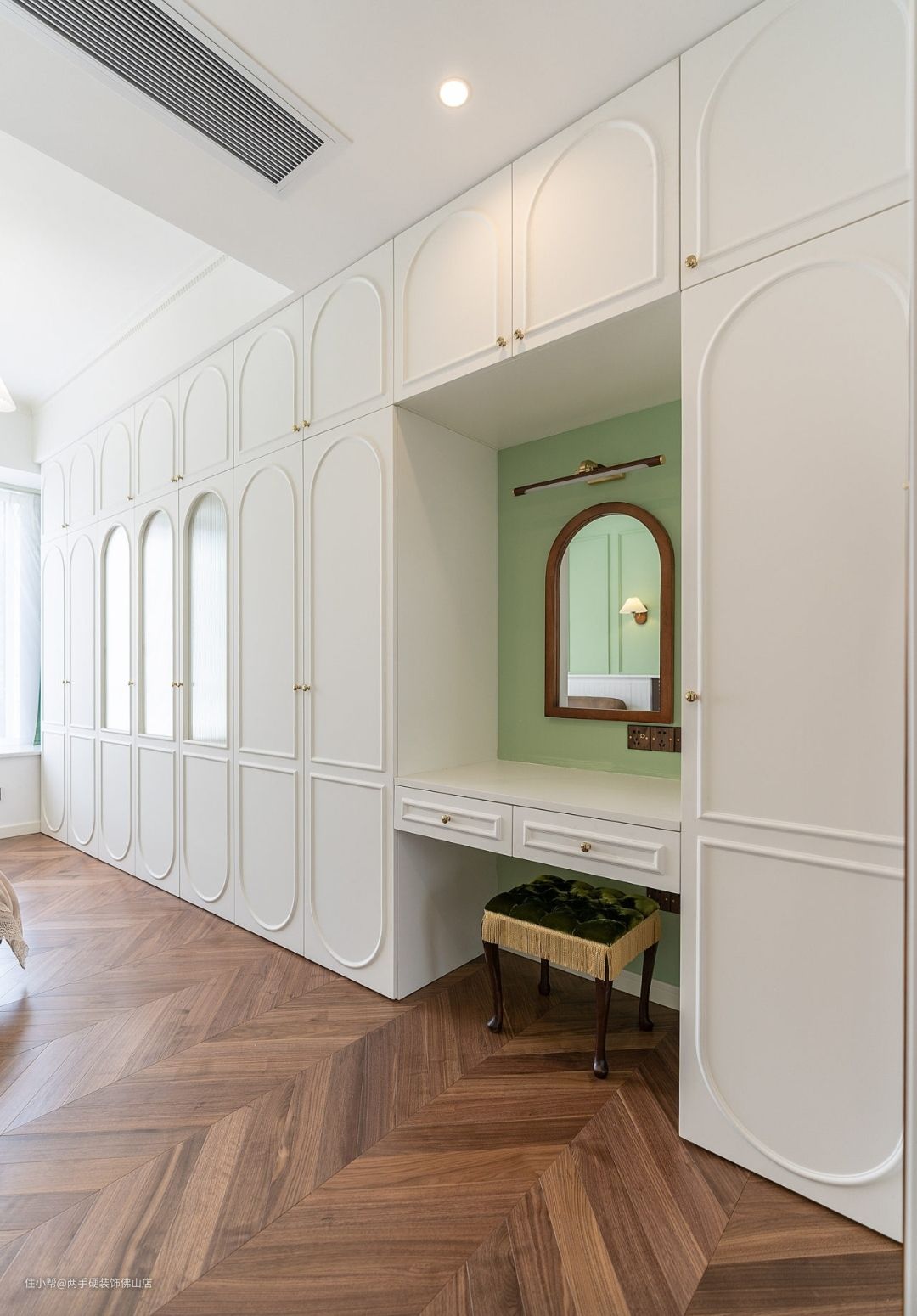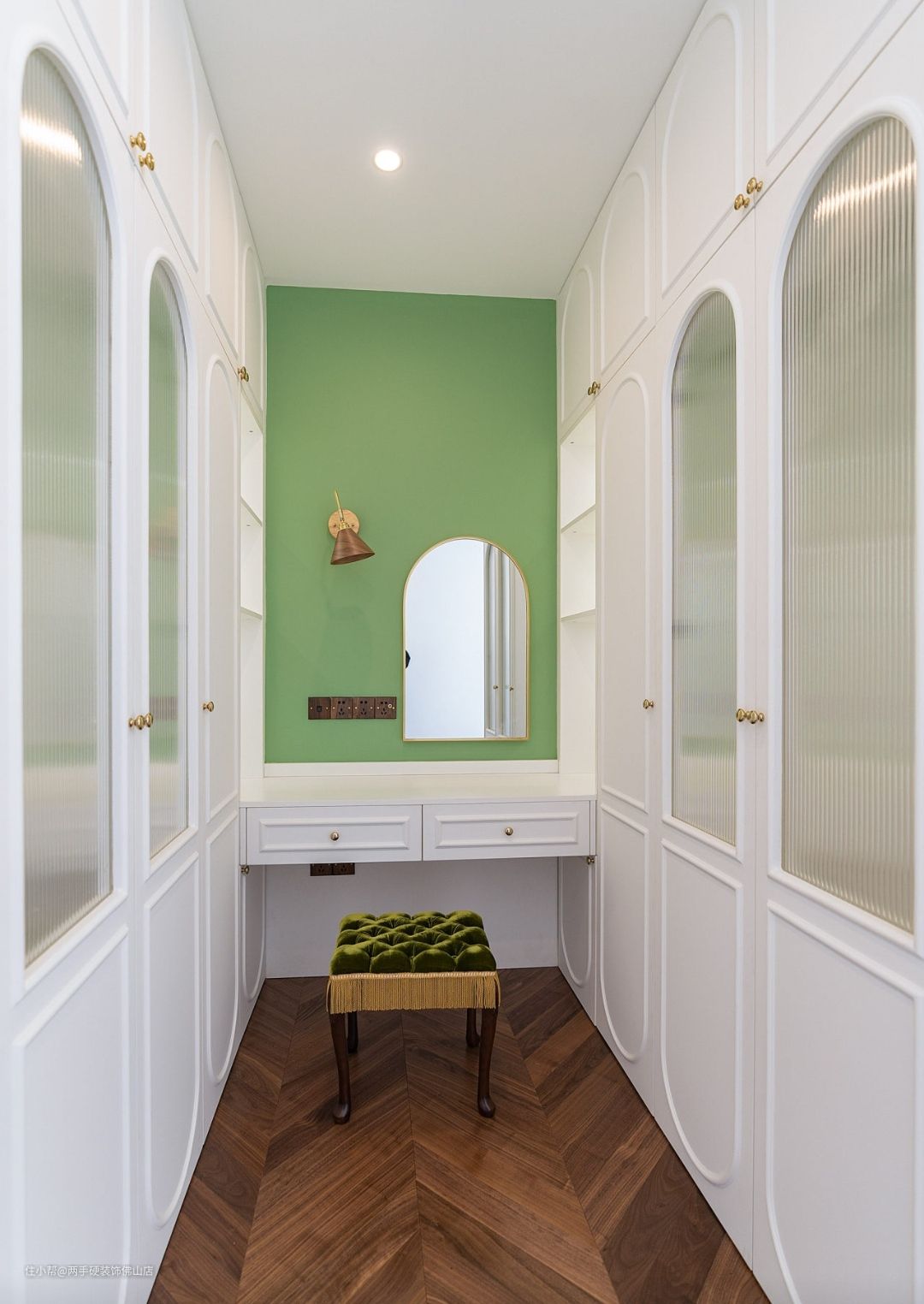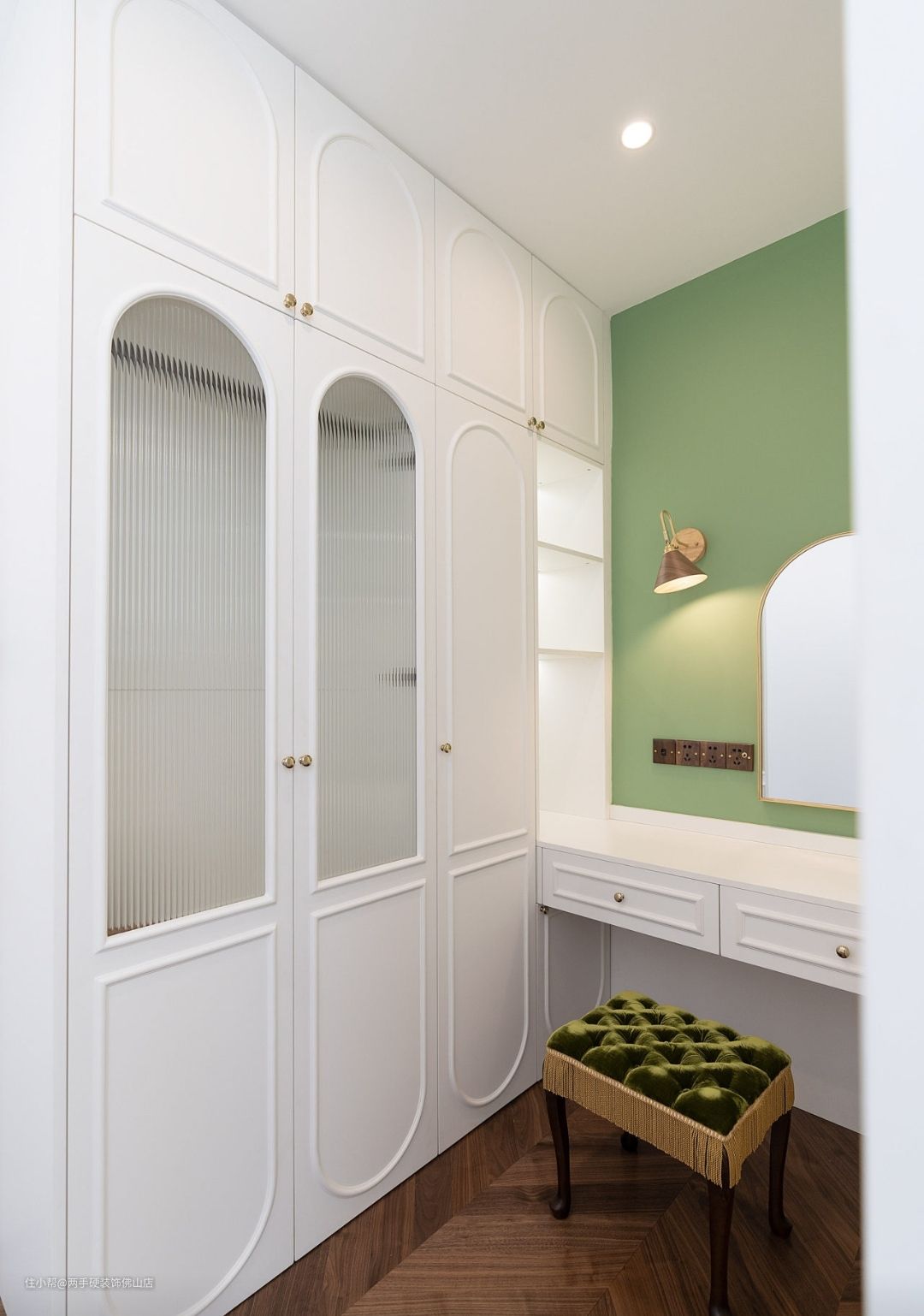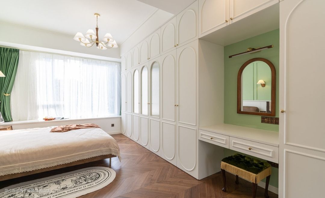 简白的柜体搭配抹茶绿绿梳妆台背景墙,以及精致的丝绒妆凳,在形成视觉c位的同时,也不会让狭窄的空间产生压抑感。定制的恭喜柜门简直惊喜。
