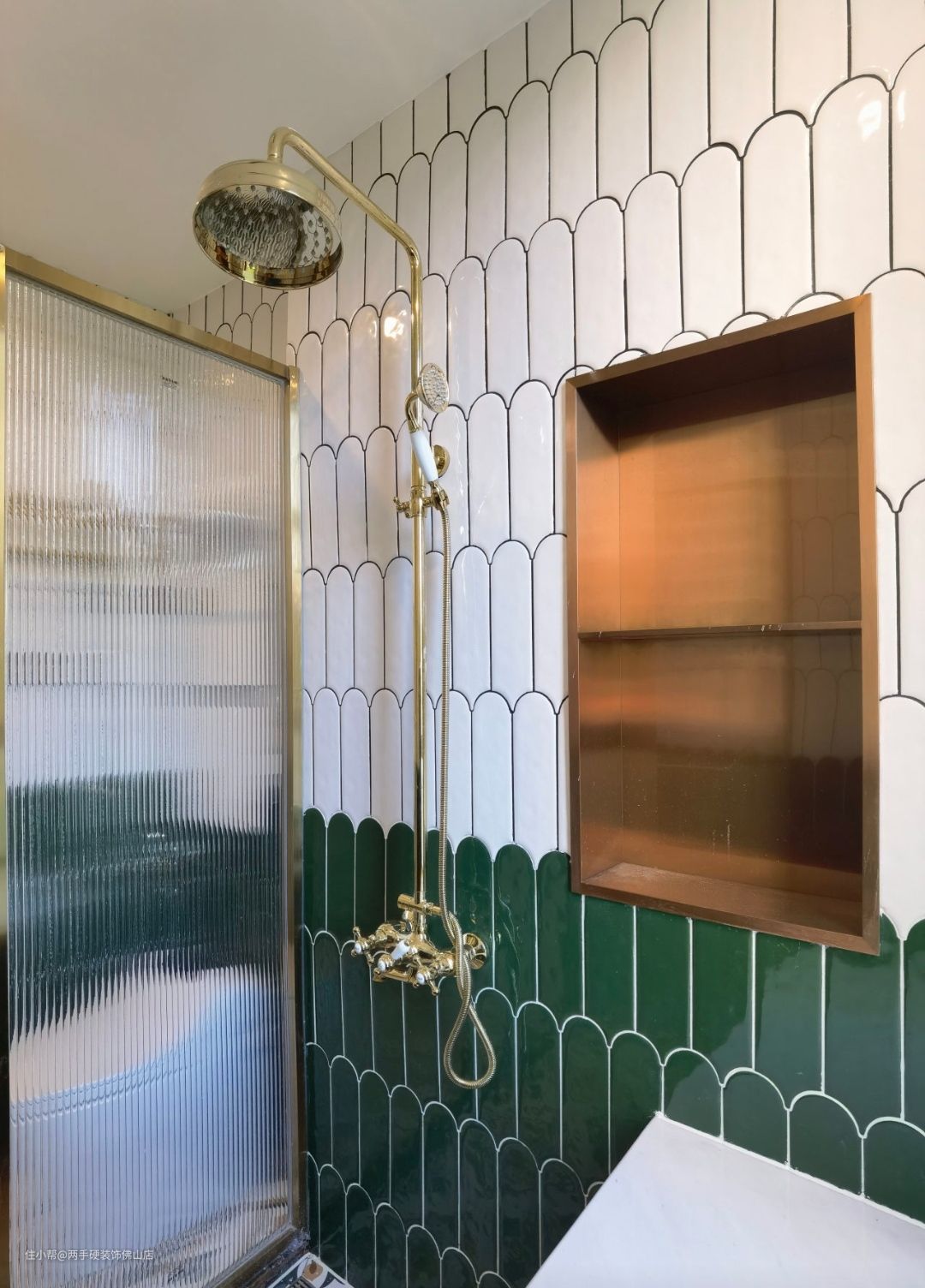 同样在墙面挖出壁龛的空间,科勒的复古金色花洒和浴室是完美的搭配。
