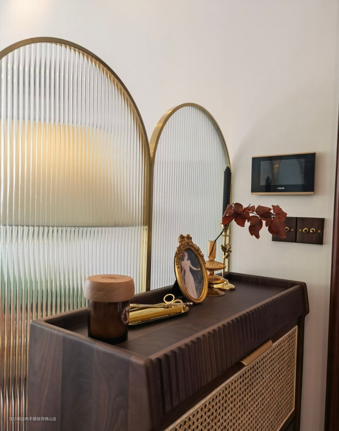 微凸的拱门状线条搭配金色铆钉把手,轻奢的法式气息扑面而来,长虹玻璃元素的融入,进一步增加了空间的通透感。