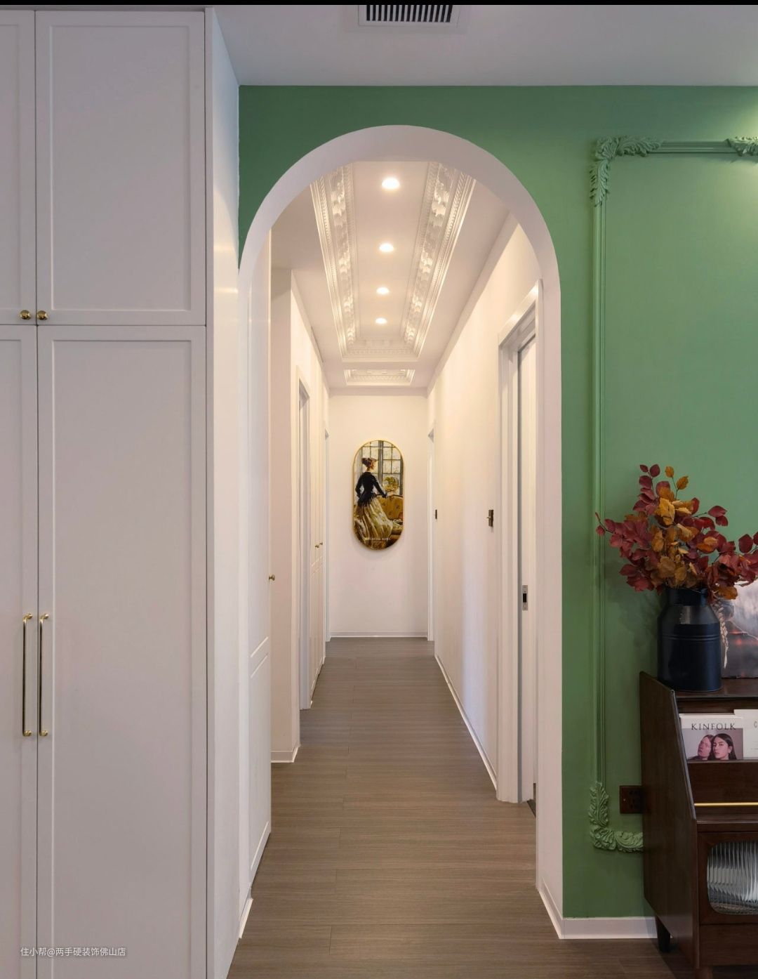 走廊也做了业主喜欢的拱形造型,天花处理用了法式线条装饰做走廊,增加空间的深邃感和精致。