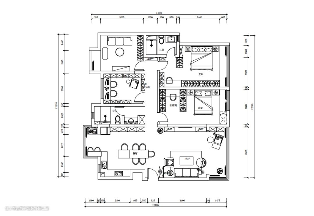 户型改造: ①把卧室门做调整,改变了大门直对卧室门的尴尬。 ②在走廊上往书房借了一部分空间,增加了储物空间,解决了鞋子和杂物的收纳问题。③做开方式厨房+岛台,扩大了厨房的操作空间。④公共卫生间做三分离,并且还有独立的挂衣挂包收纳空间。主卧做一字型衣柜和梳妆台,显得整个房间都视野开阔。⑤次卧做衣帽间加梳妆台,收纳空间翻倍。