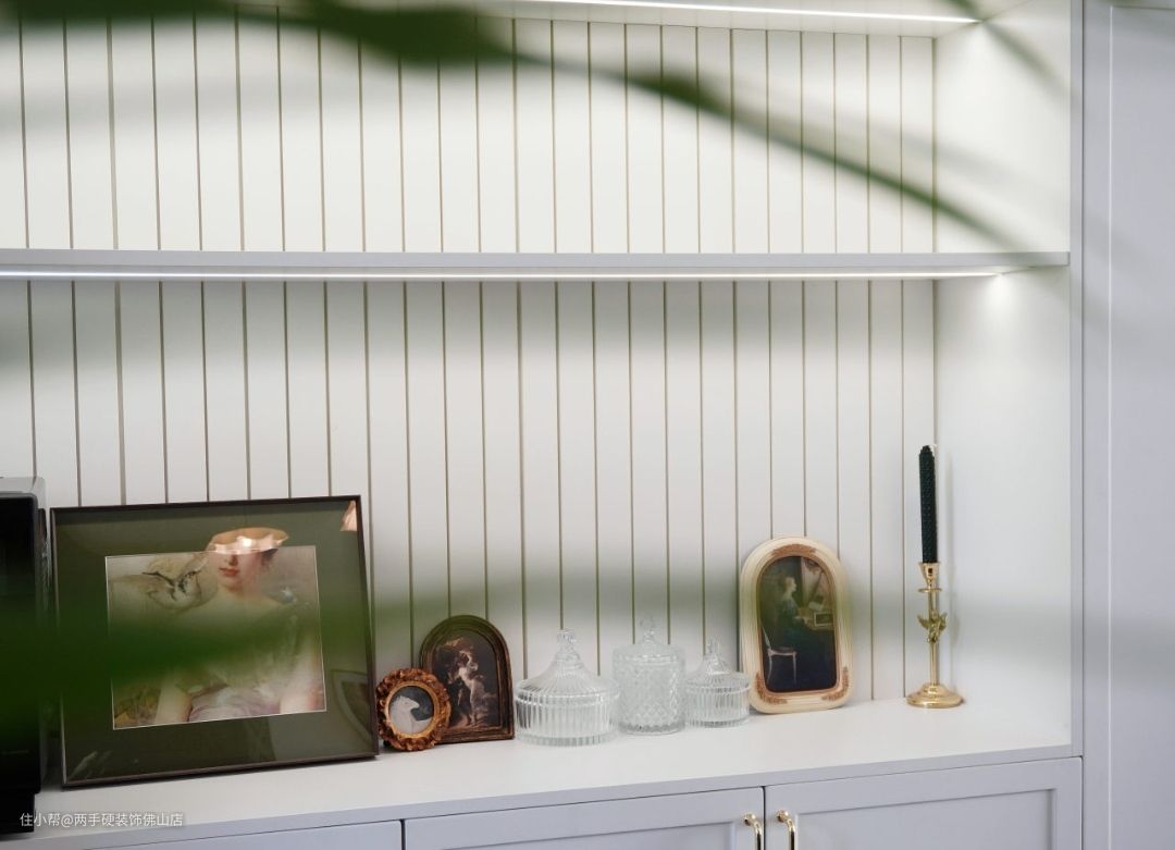 中部挖空做成展示隔板,背景板做成格栅,在减少厚重感的同时也满足了屋主多功能的收纳与展示需求。