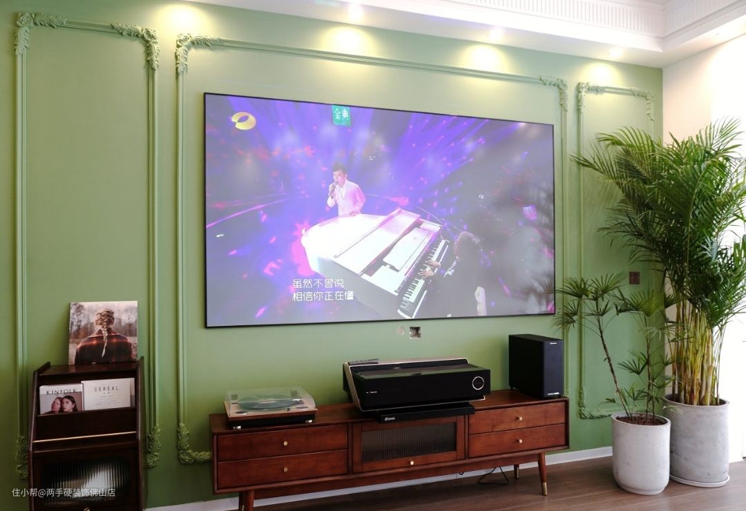 电视搭配:黑胡桃木电视矮几搭配巨幅激光挂式电视,客厅空间的档次瞬间被提升。