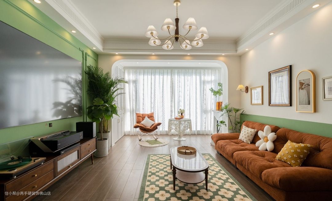 客厅:以牛油果绿和焦糖色打底的客厅,给人一种自然清爽之感,仿佛步入了一处森林秘境。风琴盏主灯搭配吊顶筒灯,轻松get360°无死角照明体验。