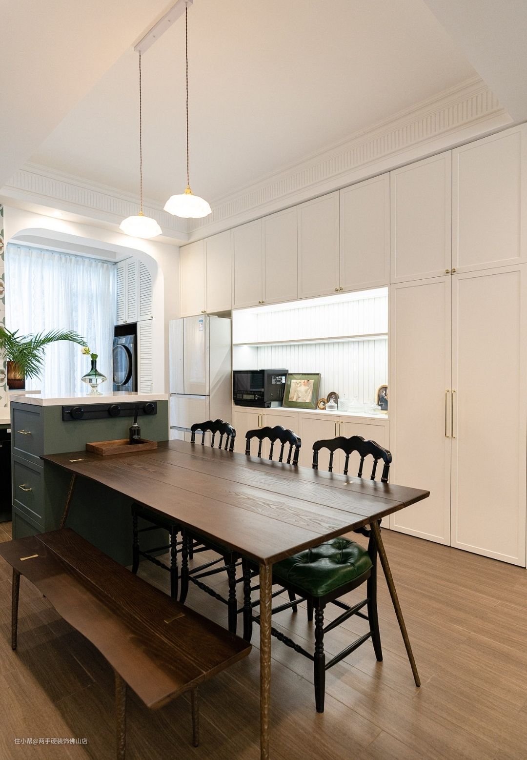 工作阳台也做了复古的百叶门,把洗衣机烘干机嵌入预留好的尺寸里,全屋的净水系统也藏在这里。
