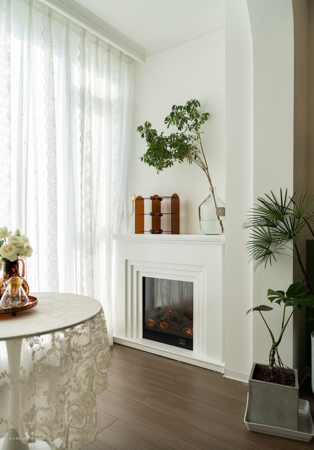 蕾丝窗纱和桌盖布飘逸轻盈,随手放置几盆喜爱的绿植花卉,生活情趣满点,让每次围炉小酌都变成享受。