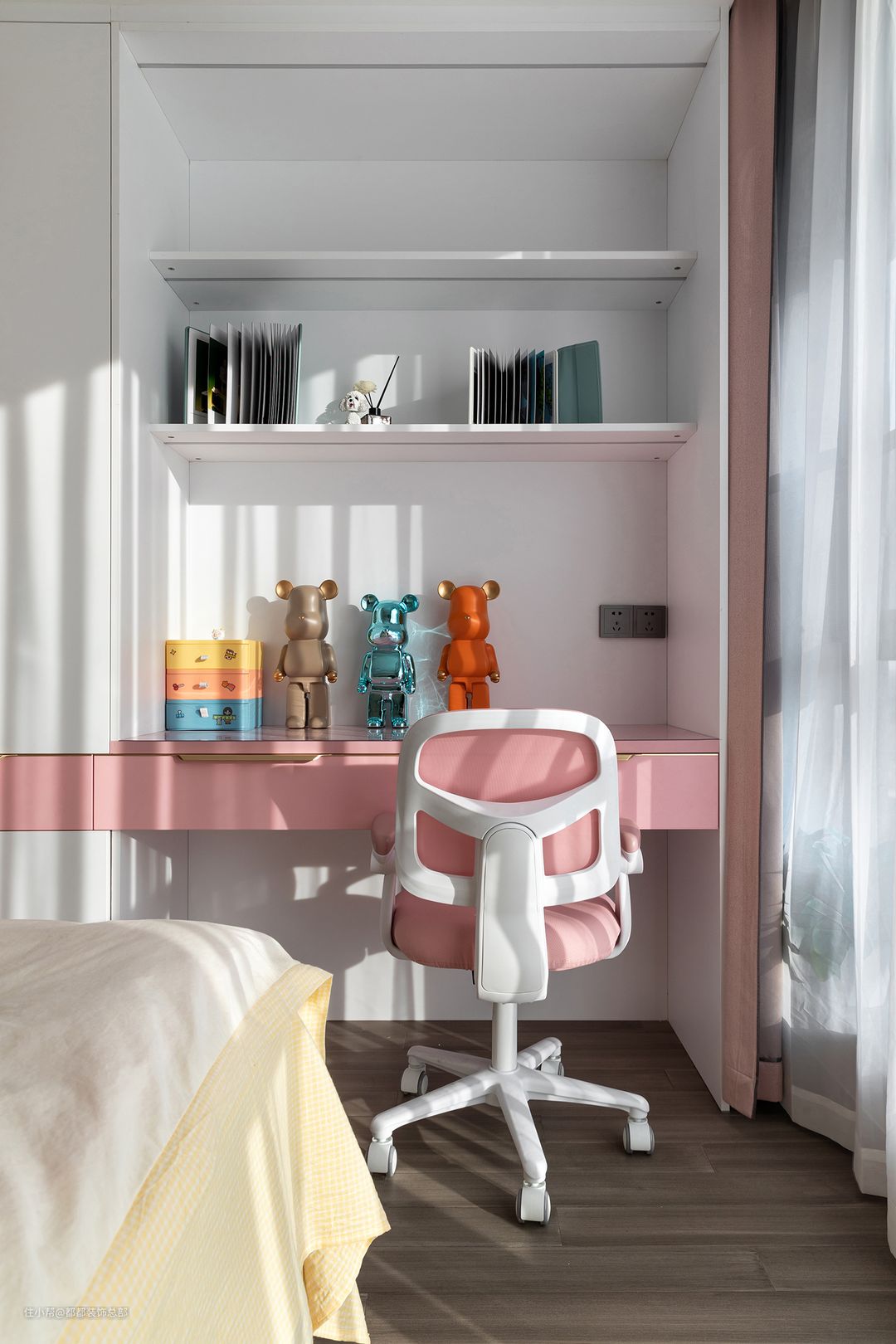 儿童房是每个孩子幼时的一处秘密基地,设计师耐心听取女孩的想法,选择了她喜欢的粉色色调,粉色搭配,俏皮又优雅,大面积的白色色调将粉色的跳跃彩度降低,硬装与床品的陈设营造出素雅温柔的氛围,重在各个年龄段都能够使用。