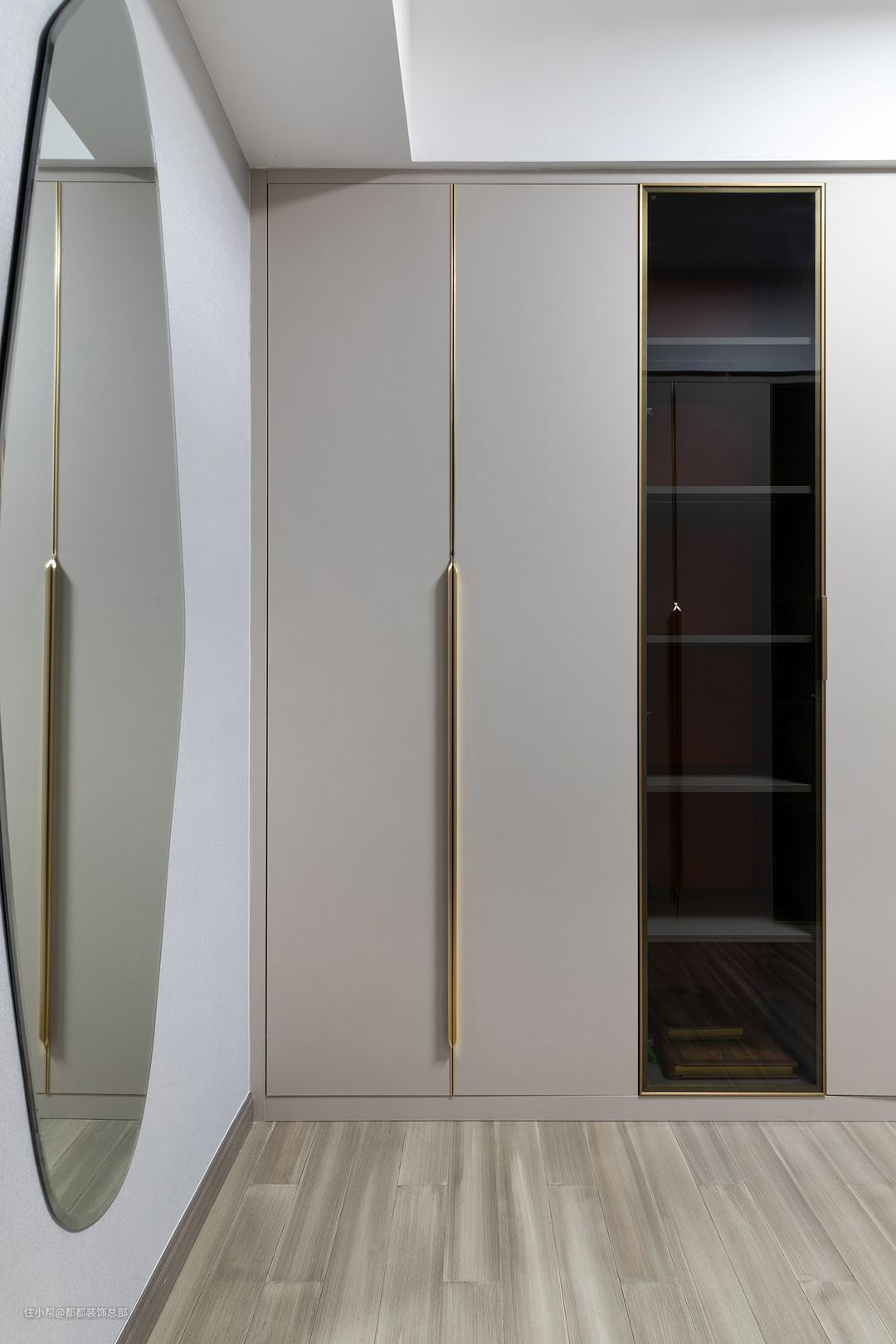 创新的利用室内角落空间,靠墙位置规划出一个梳妆台,白金的配色优雅又浪漫,小巧轻盈的造型但储物功能超max,空间整体感也超nice!隐藏步入式衣帽间空间适合,收纳分区合理,实用又有仪式感~