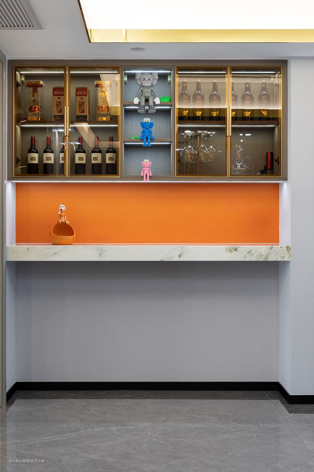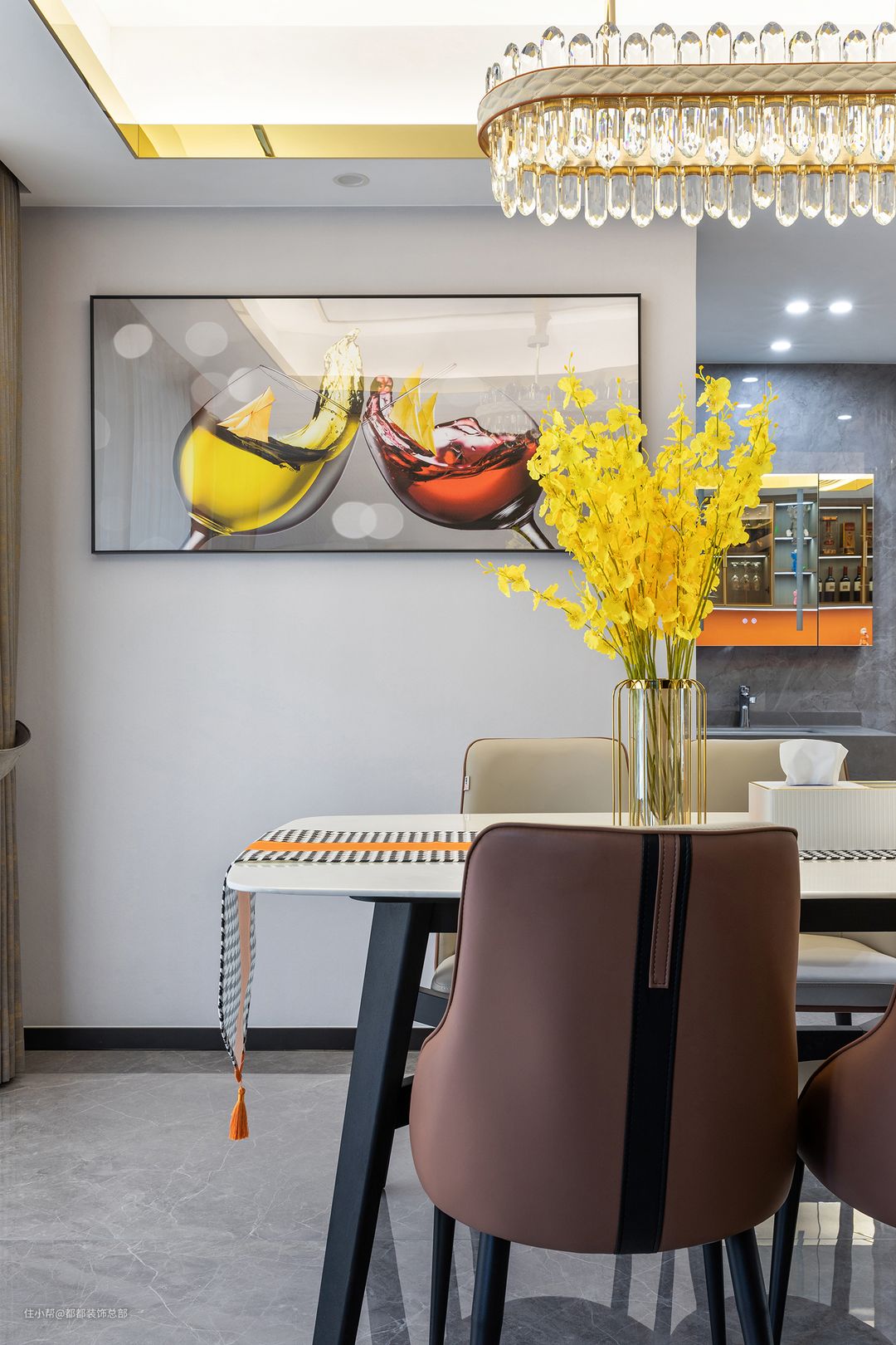 餐桌靠墙一侧做了半面酒柜,形式独特,减少了压抑感与拥挤感,在提供不俗收纳空间的同时,保证了空间色调的统一性,温暖又显高级。