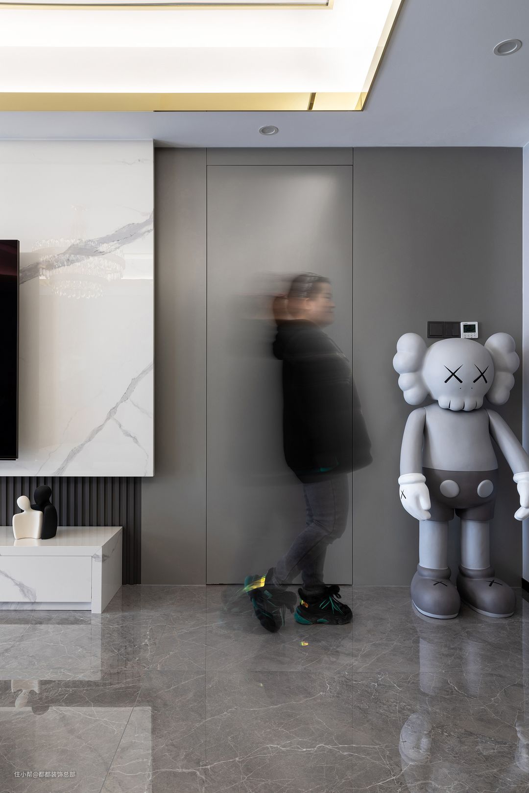 高级灰的沙发背景墙与黑白时尚挂画形成撞色设计,一深一浅,增添了墙面的层次感;电视墙以多种材质构成,悬空白色大理石呈现出干净利落的空间画面,内嵌深灰色木饰面,减轻了视觉上的沉重感,美观且简约实用。