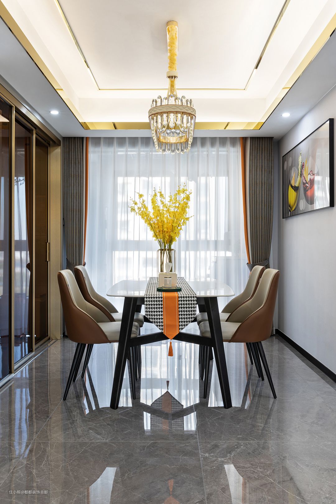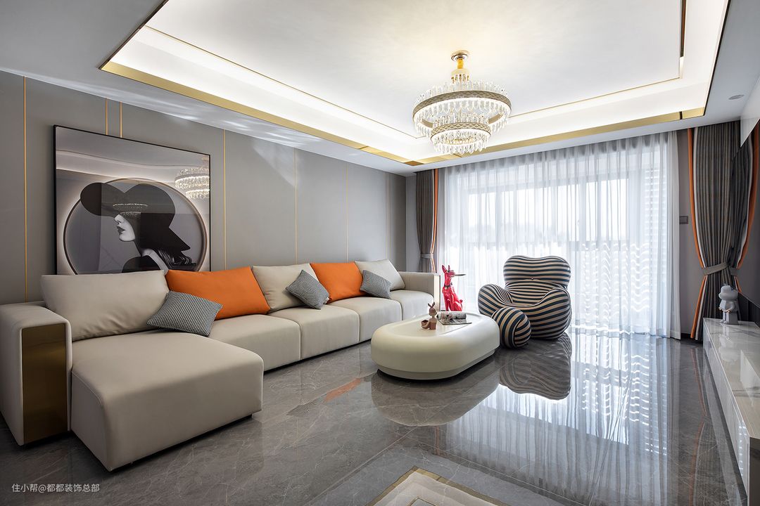 静雅的绅士灰为主基调,宽敞通透,浅灰色皮质沙发与亮橘色抱枕完美结合,打造出时尚沉稳的魅力会客厅,简约大气的吊顶视觉上拉长层高,吊灯造型精致,透过每片水晶互相折射使光源柔和而均匀的散布于空间内,高雅而不失轻盈。