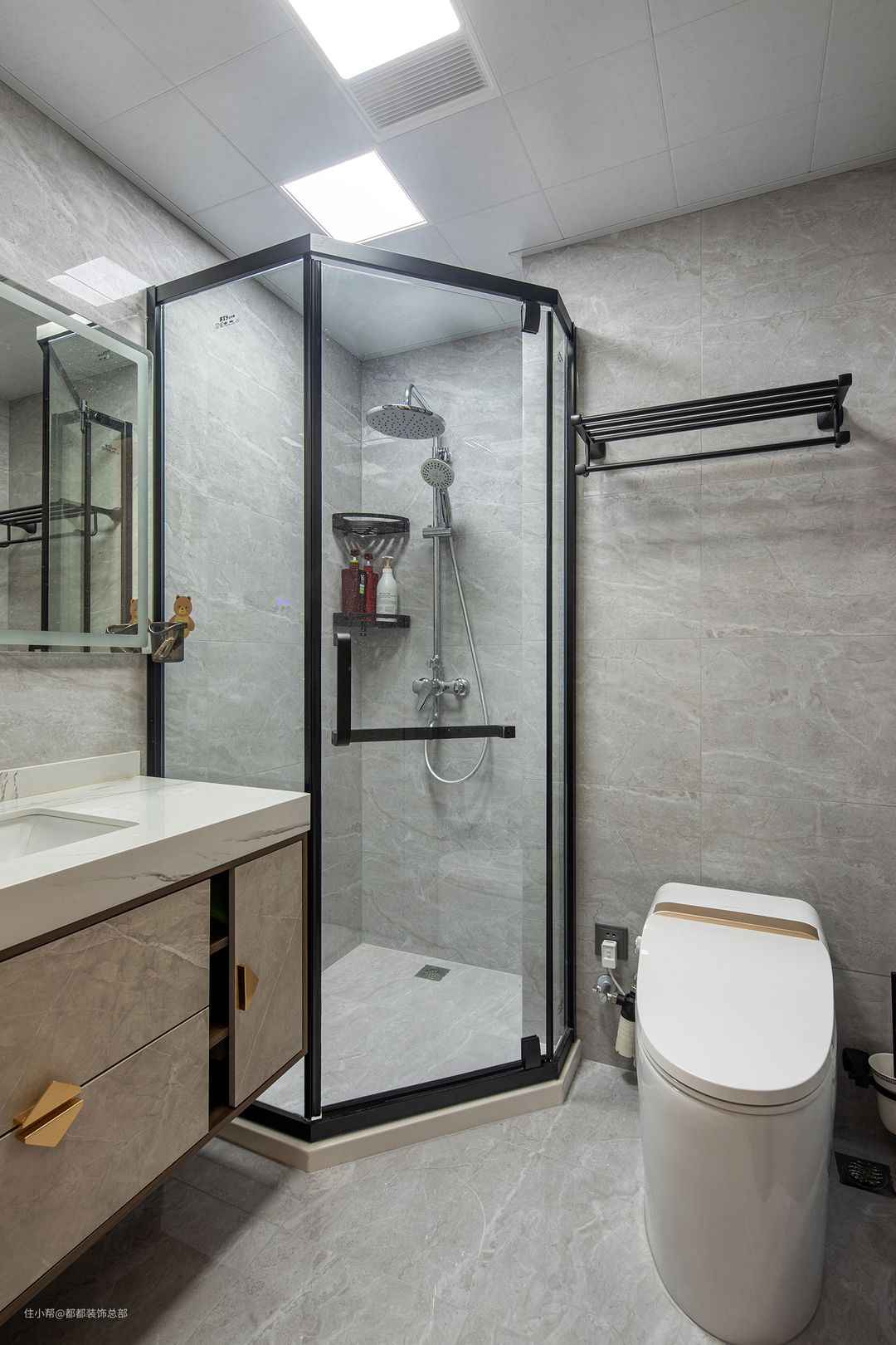 次卧的卫生间去繁化简,同样做了干湿分离处理,没有繁琐的装饰,线条简练柔和,高级灰的色调大气简约,搭配磨砂质感的储物柜,储物功能强大又不乏设计美感。