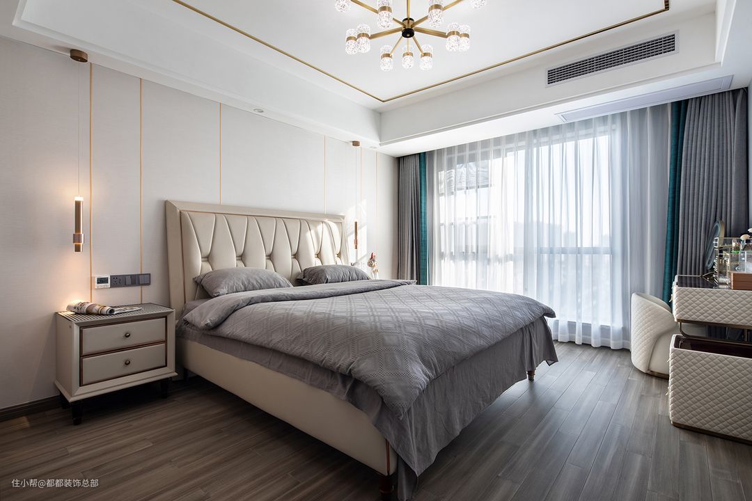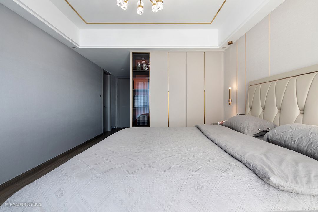软包床头即舒适感和颜值于一体,亲肤的触感舒适至极,床品的选择温和而干净,浅灰、米白、原木棕,不同色系之间的对比过度形成了和谐的层次和节奏变化,打造出自然舒适的居住空间。