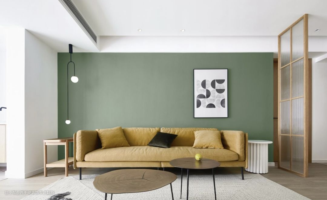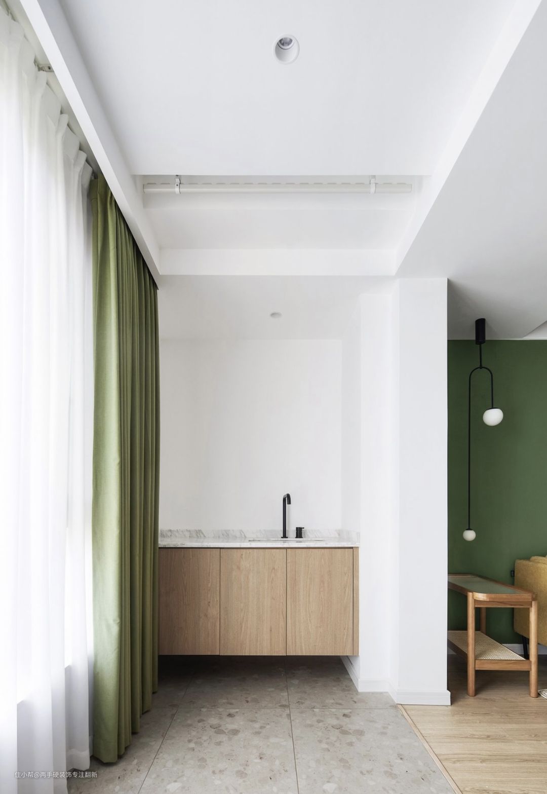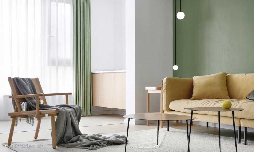 客厅这张视角,是完全还原了效果图。除了由于到阳台的两边的承重墙体不成拆除,导致改变了一些。。这套案子依旧没有所谓的背景墙,白色+原木是整个空间的主色调,沙发面和窗帘的绿色是一个主配色(其实玄玄关地面也是特意用的绿色小花砖),黄色的主沙发,就是整个空间的一个跳跃色。