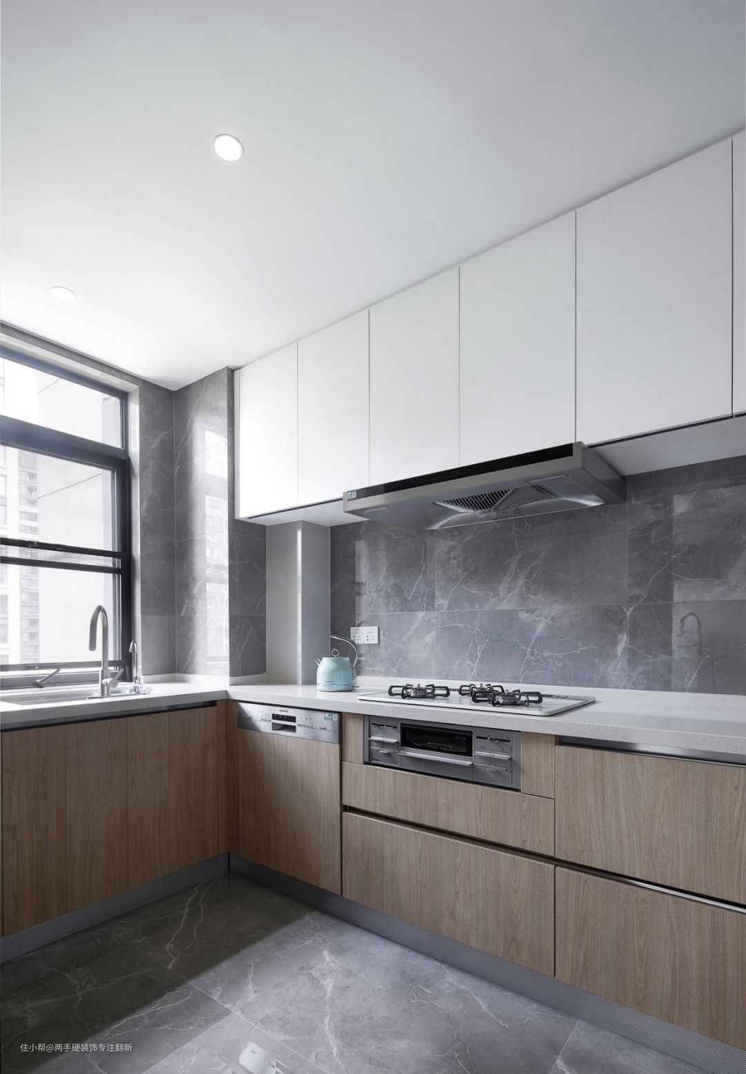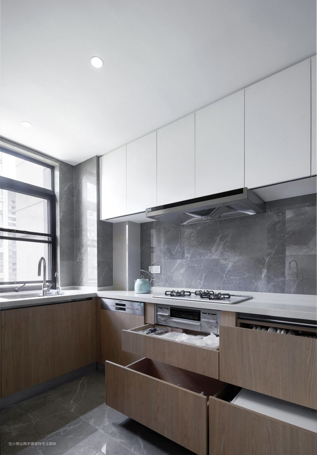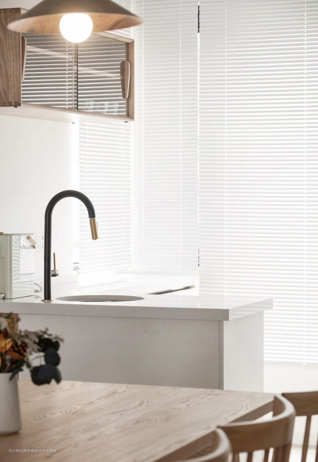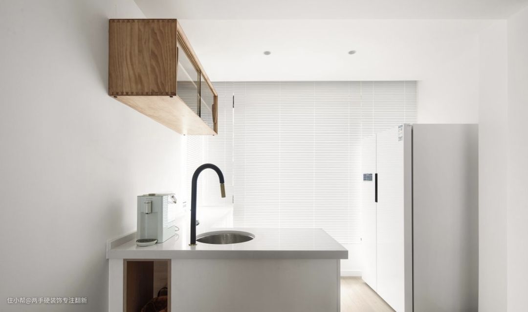 原始户型的厨房空间是一个承重墙体结构,没办法改造,许多家庭是在水槽左边再转过来一截台面,并且冰箱也是塞在进门的位置,导致空间非常拥挤。 而我们由于在西厨区域已经解决了操作台面不够已经冰箱的问题,所以原本的厨房就让它尽可能得好用,保持空间的宽敞性,方便几个人同时操作。 墙面部分,客户考虑油污问题选了亮面砖,柜子设计则比较简单,上白下原木色。