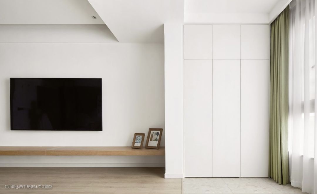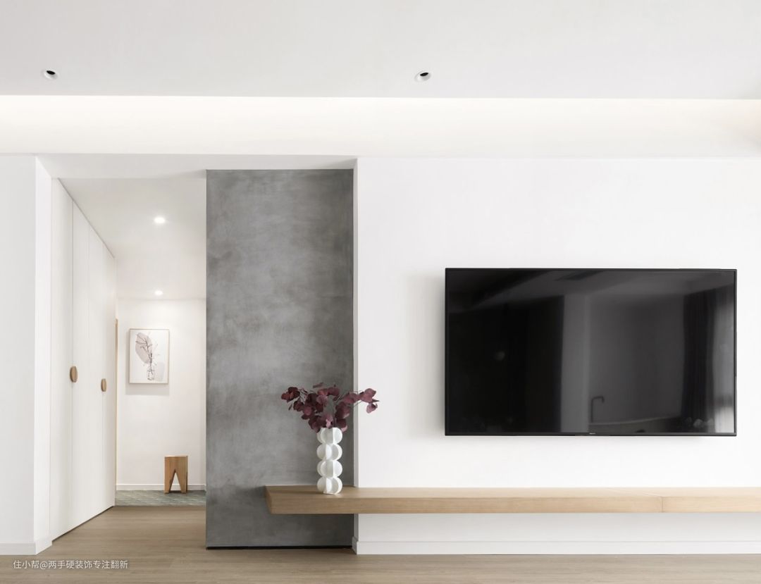 电视机的墙面处理非常简单,就是打了一部分半墙,打掉的部分刷水泥质感的艺术涂料,和电视机的台面形成了一个有一些建筑感的咬合关系,地脚线这样看比较清楚。