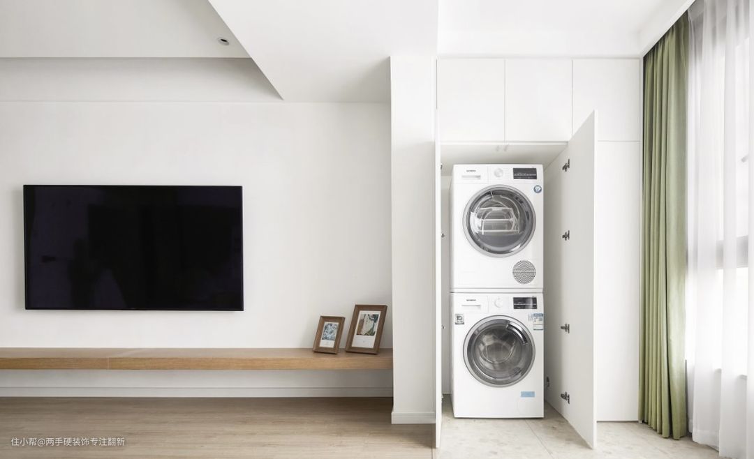 这个柜子里,左边两片门藏着洗衣机和烘干机,原计划放在公卫的,种种考虑,还是放在阳台了。右边一片门,就是收纳各种工具的地方了。