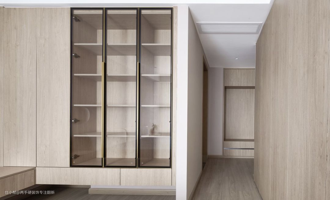 玻璃门书柜,玻璃的边框没有用普通的黑色,而是考虑和柜门的原木接近,选用了金色的。 尽头那组开放柜就是主卧门后的一组柜子,也是改变过道得到的空间,做次净衣区刚好。