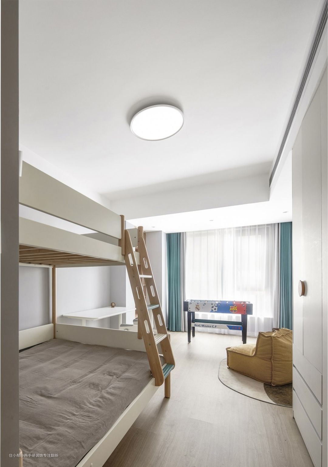 小男生喜欢上下铺,进门两侧分布床和衣柜,靠近窗户边的就是学习区+阅读区+休闲娱乐区,太舒服这位小朋友了~