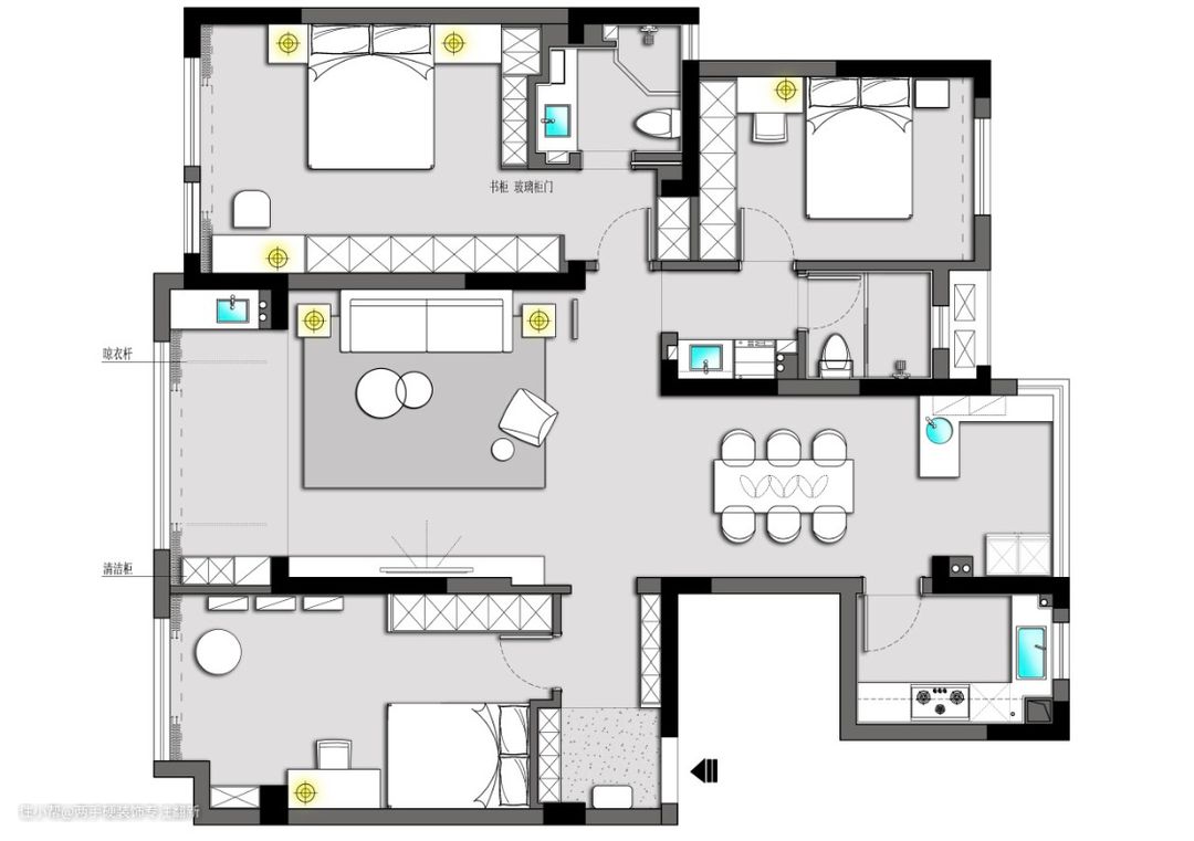 1、小孩房需要的空间比较大,所以考虑把阳台一分为二,玄关的位置通过改变过道,由原来的一组柜子,增加为两组玄关柜。 2、利用原本的北阳台改成西厨,同时容纳一个大冰箱,西厨的摆放方式为转角L型,主要是考虑餐厅过长过窄,加上方便家长照看客餐厅。客厅部分考虑动线布置把沙发放在了对着公卫的一边,所以在沙发的旁边设置了一个小隔断,来阻隔视线,也是风水考虑。 3、主卧和次卧改变动线,把公卫干区当成过道,由原本的门对门,改成了没有过道的形式,原有过道就利用给两个房间,增加收纳,主卧的深的衣柜放在床对面,靠窗的一边做书桌,靠卫生间的墙做书柜,这样就满足了客户增加一个书房的功能了,同时,主卧卫生间也比之前更好用,主卧床两边也有非常大的活动空间,一举多得~ 4、由于改造后房子的收纳足够多了,所以原计划利用电视机墙做的电视收纳柜,就可以取消了。