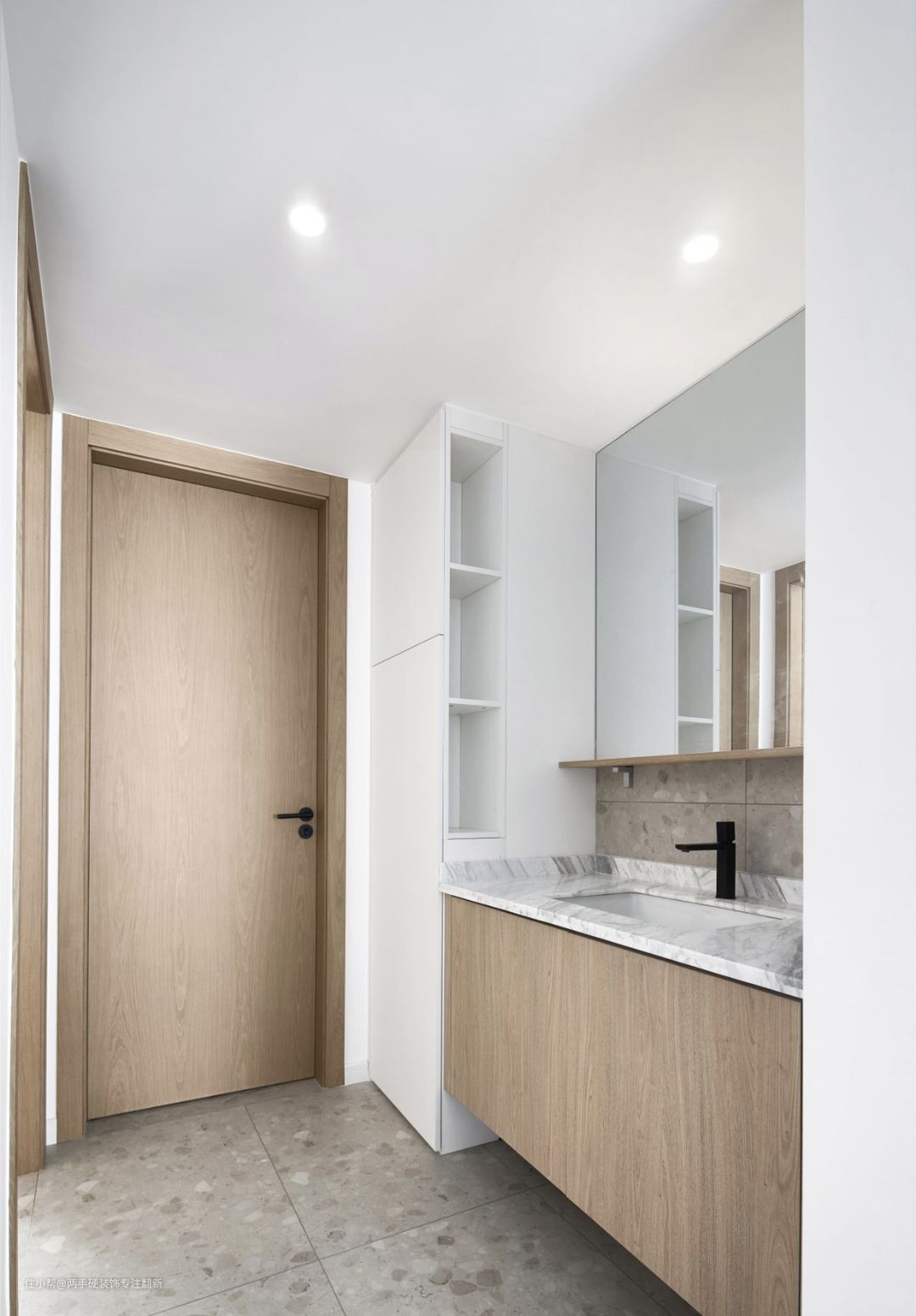 公卫的里面空间比较小没有拍摄,上图是我们公卫的干区,也就是洗漱柜的部分,正对面的门是通往湿区的,左侧的门是通完次卧室的(房门打开没有正对镜子,所以不会有风水问题哦)。浴室柜左侧的白色柜子里面其实是两根水管,我们利用角落空间,一部分设置壁龛放洗漱用品,打开白色的柜门,里面则可以放戴森或者卫生间的小清洁工具。 镜子部分是没有用镜柜的,直接一张银镜贴墙,镜子和下面的瓷砖之间用一块层板做分隔,也是可以放洗漱用品的。 考虑到溅水问题,这个区域地面贴的瓷砖,选用和阳台同色的,带一些粉色调的,600*1200的瓷砖。