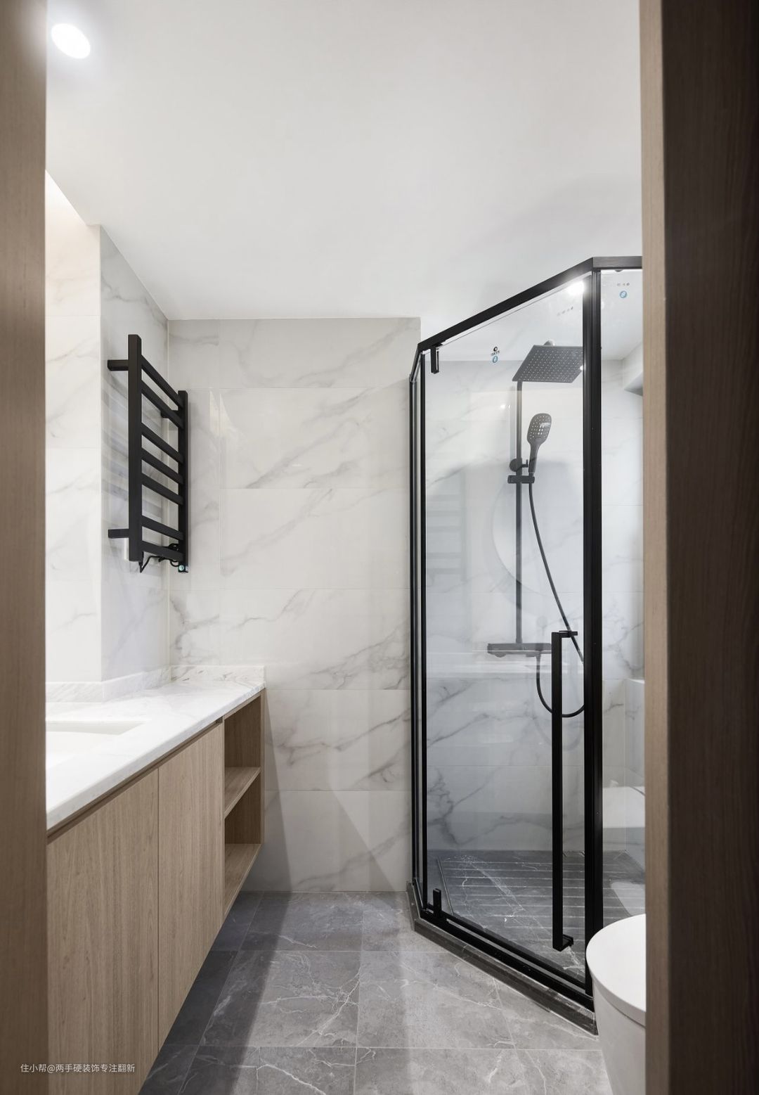 主卧的卫生间,窗户小,用的白色墙砖,金属类统一亚光黑色。 这个卫生间是户型改造后形成的,原本的卫生间是非常小,布局也是不合理的。改造后的卫生间洗漱台面部分有深有浅,对应的是墙后面的浅书柜+深衣柜的配置。洗漱台右边墙面空间利用起来放置电热毛巾架,底下做开放柜,平时放置浴巾等卫浴用品,左边照片没拍到的位置,顶上是一排的反光灯带,做照明补充,这样照镜子的时候就不会脸上逆光了~