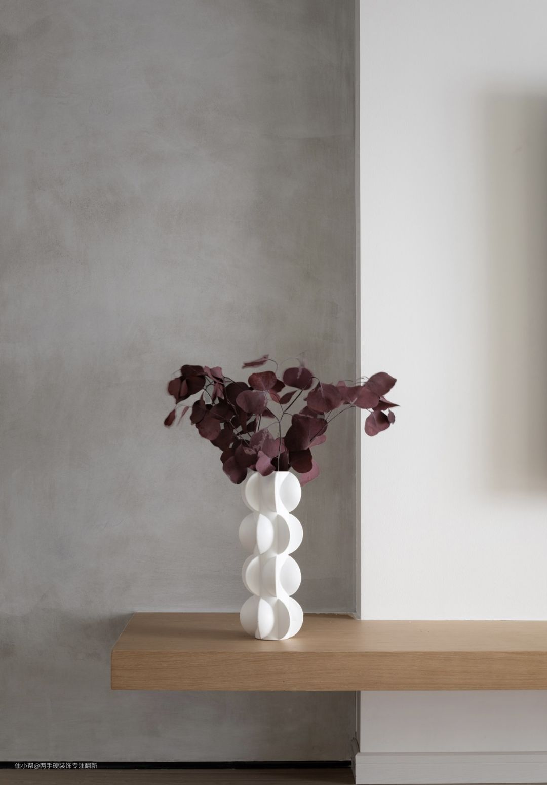 注意我们的水泥色的墙面,这一部分是做的暗藏地脚线,因为全房做暗藏成本比较高,所以其他墙面都选用的普通明装地脚线,但是这个位置如果也装白色木地脚线就太突兀啦,这些都是细节。
