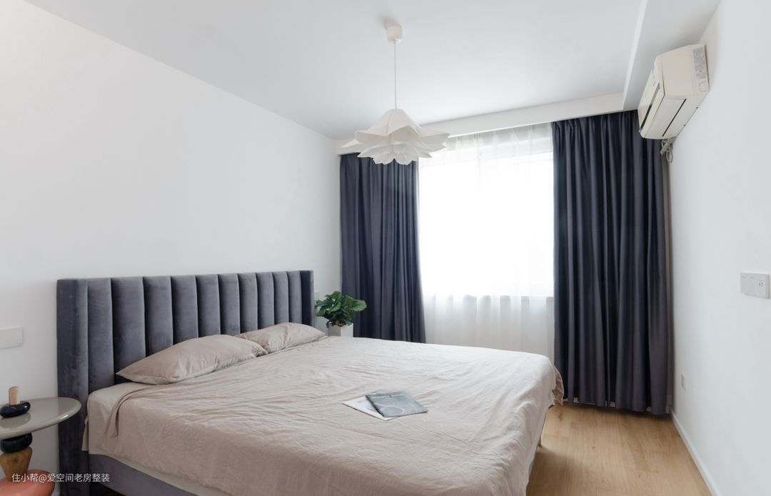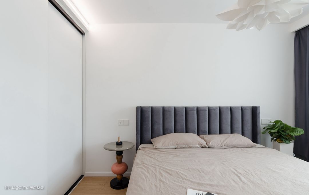 衣柜推拉门设计,三面白墙相组合,形成大片留白区域,简简单单。灰色靠背床和灰色窗帘同色系,相呼应。