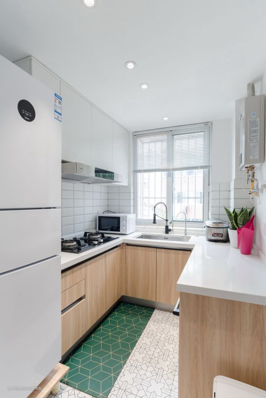 厨房内部U型设计,从上到下以此是白色、原木、花纹地砖和几何地毯,空间层次分明。中间一面大窗,让空间更显通透。